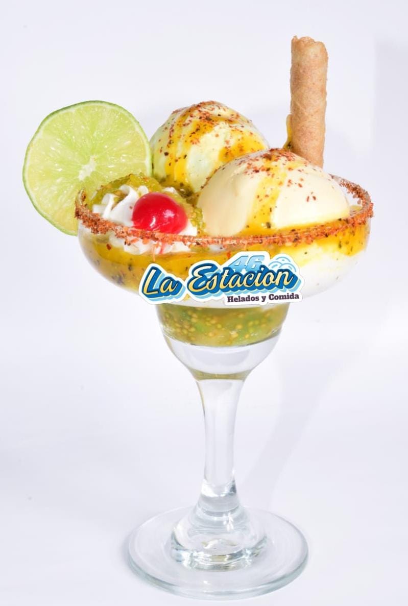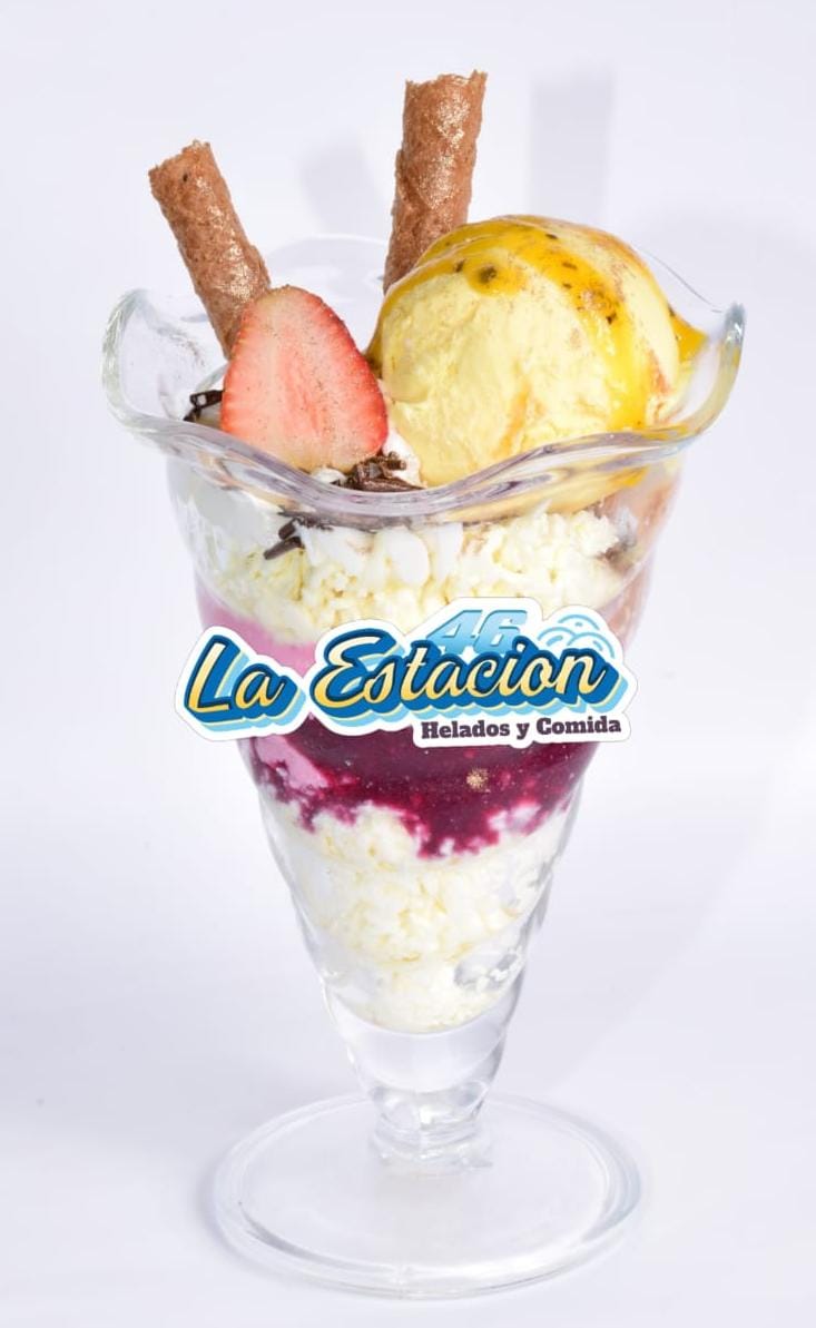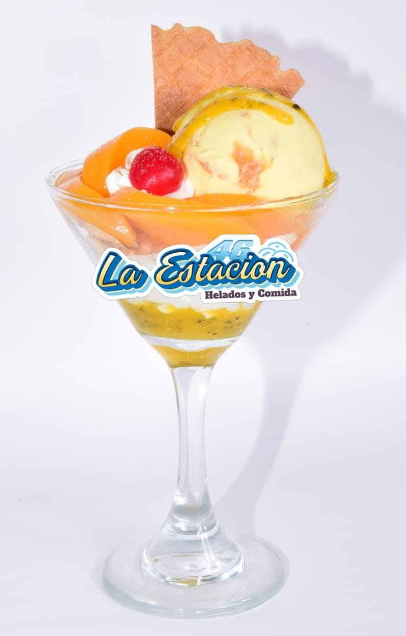 Ingredientes: dos sabores de helado, chantilly, Tajín, lulo, limón, salsa maracumango, cereza y barquillo.