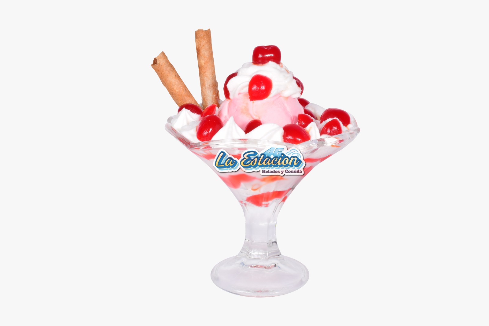Ingredientes: helado, chantilly, fresas, salsa natural y barquillo.