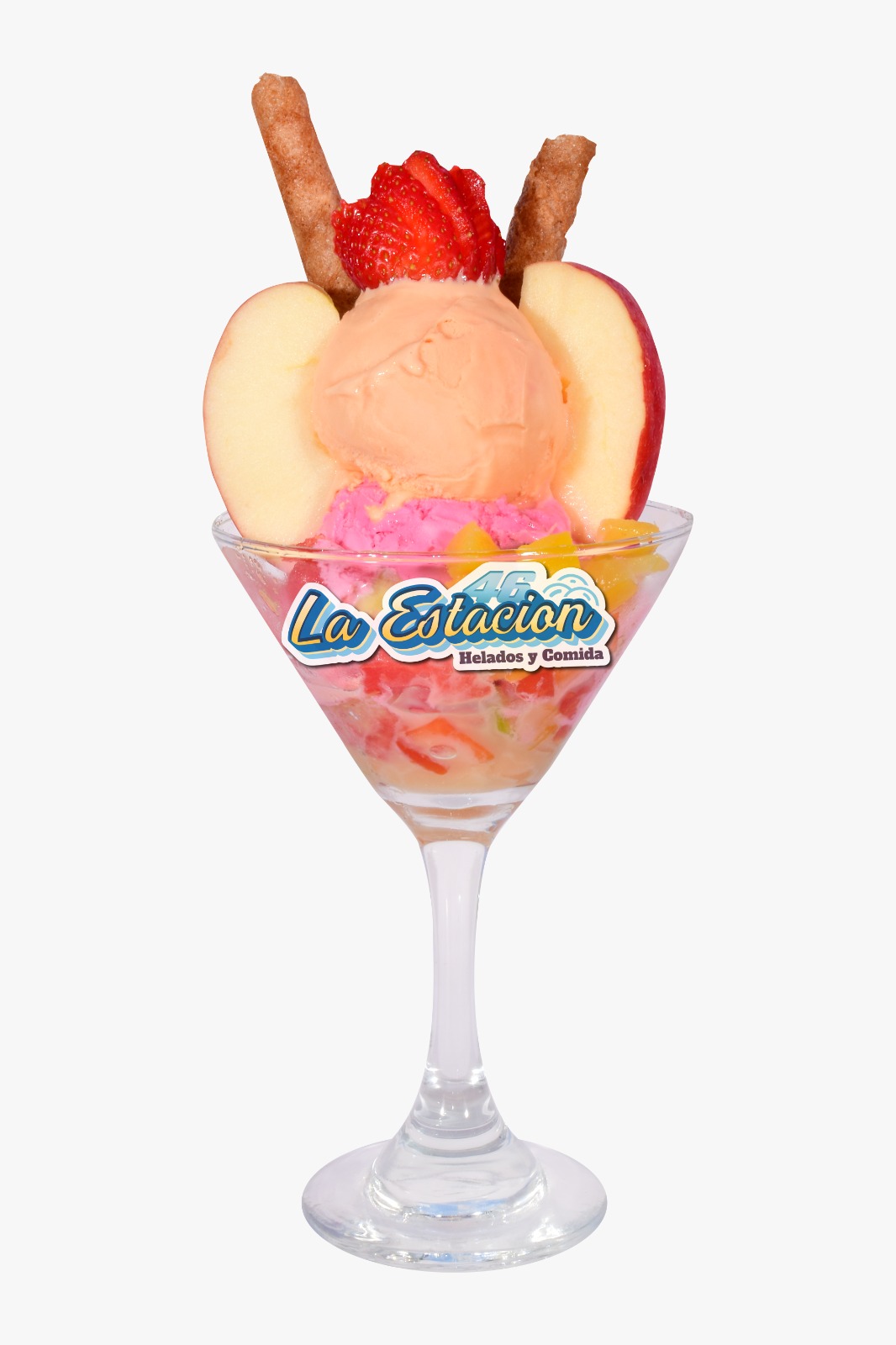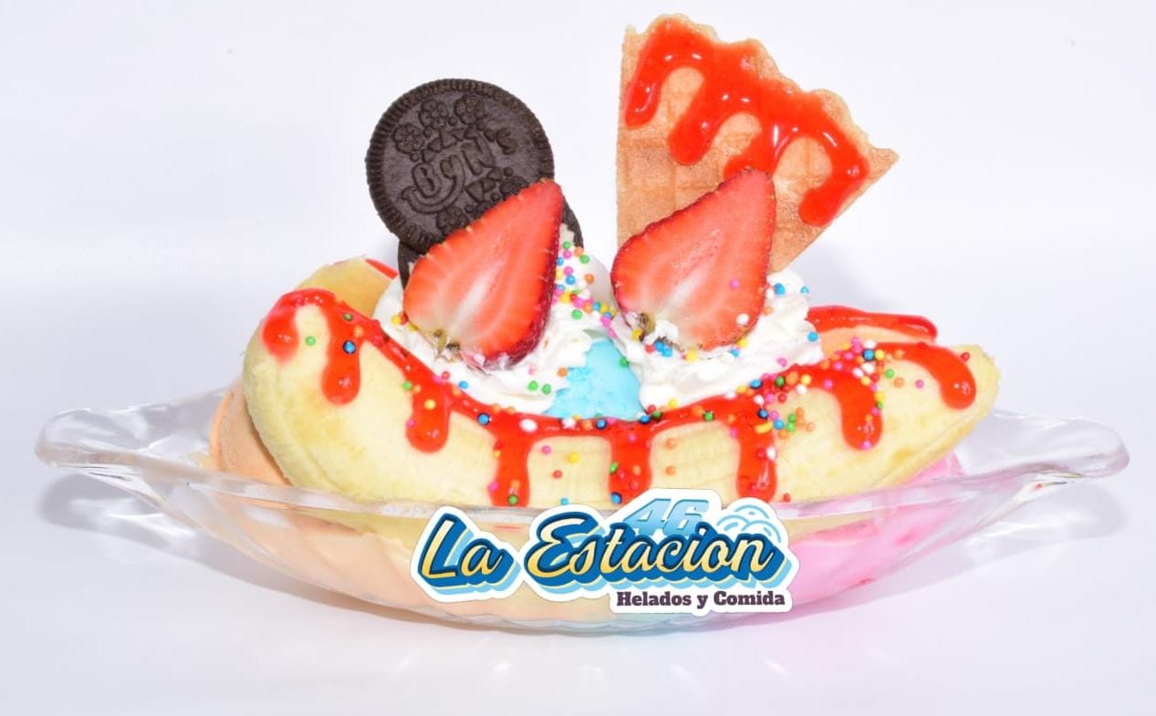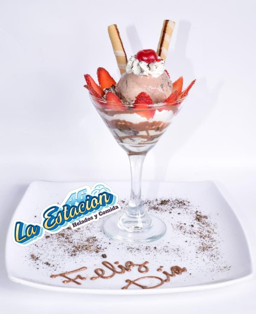Ingredientes: dos sabores de helado, salsa, fresa, barquillo, queso y chantilly.