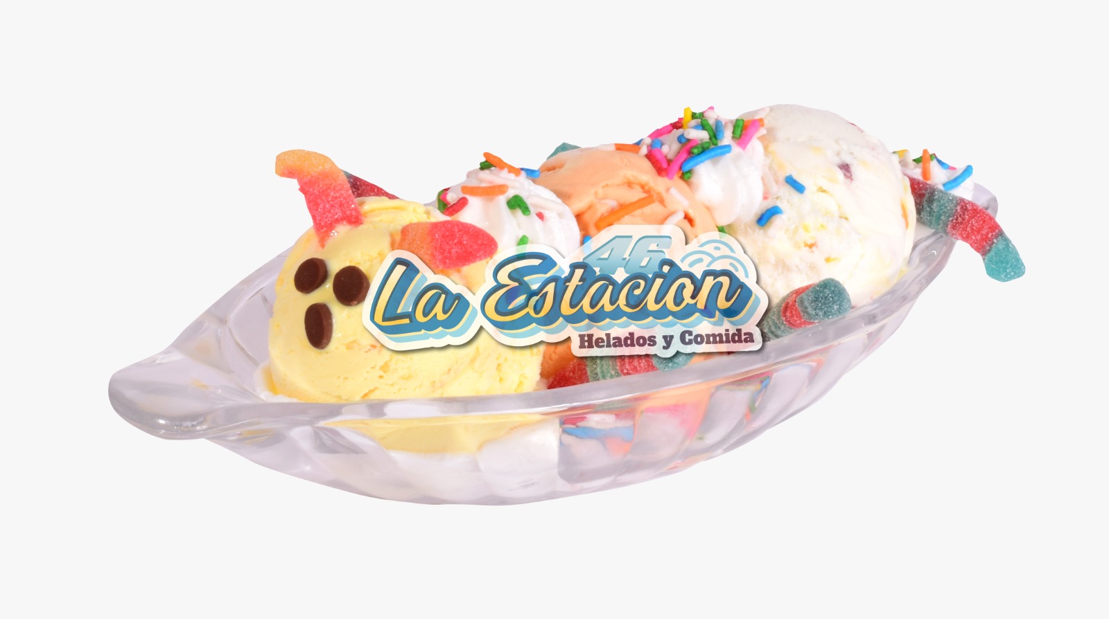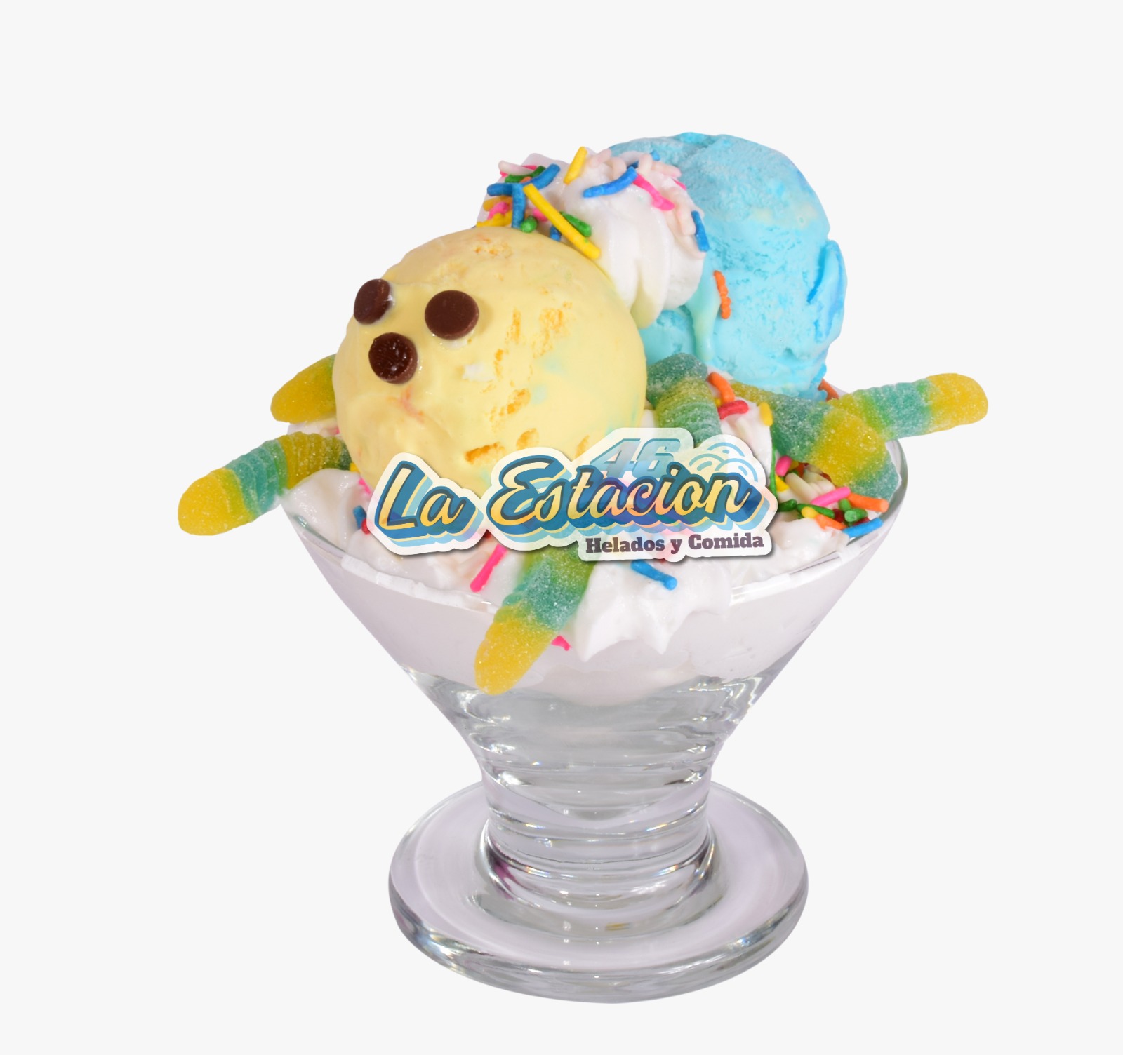 Ingredientes: gusanitos, chantilly, chips de chocolate, lluvia de colores y 3 sabores de helado.