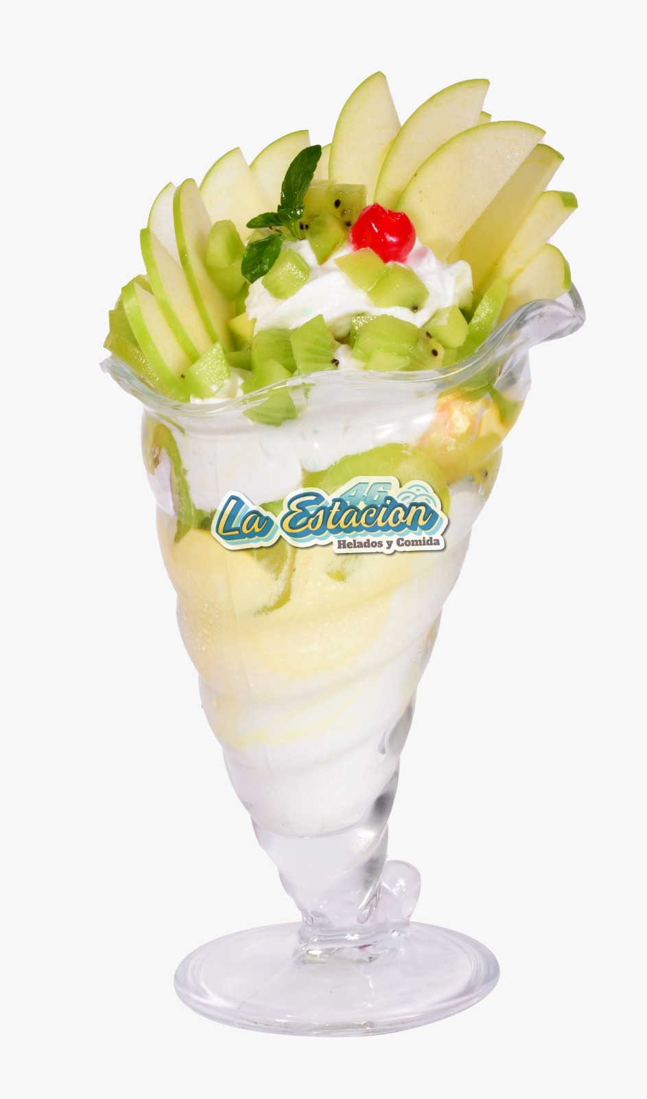 Ingredientes: dos sabores de helado, kiwi, manzana verde y cereza.