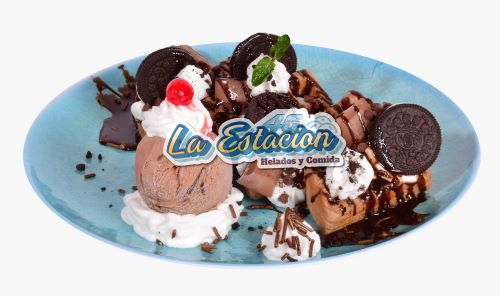 Ingredientes: wafle caliente, galleta oreo, salsa de chocolate, chocolatina, chantilly, cereza y helado.