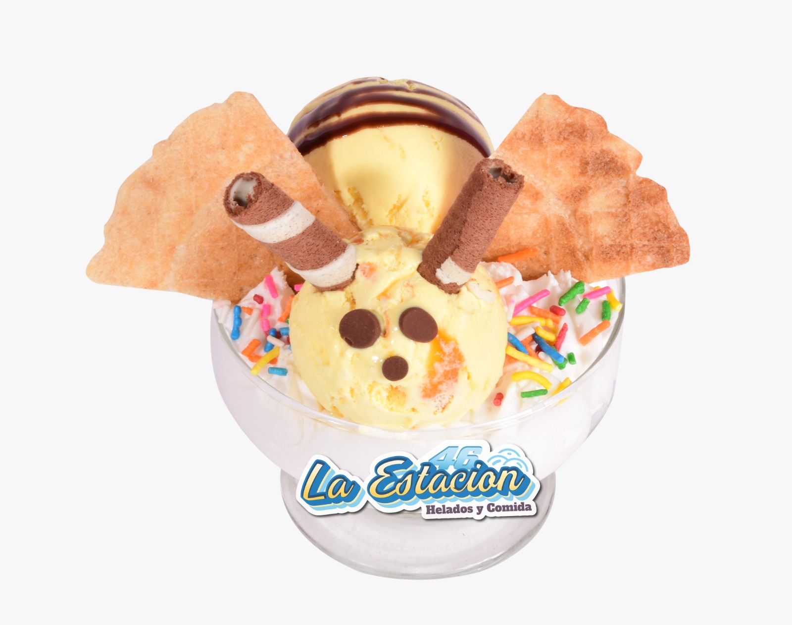Ingredientes: másmelo de colores, chantilly, lluvia de colores, piazza, abanico, chips chocolate, salsa y 2 sabores de helado.
