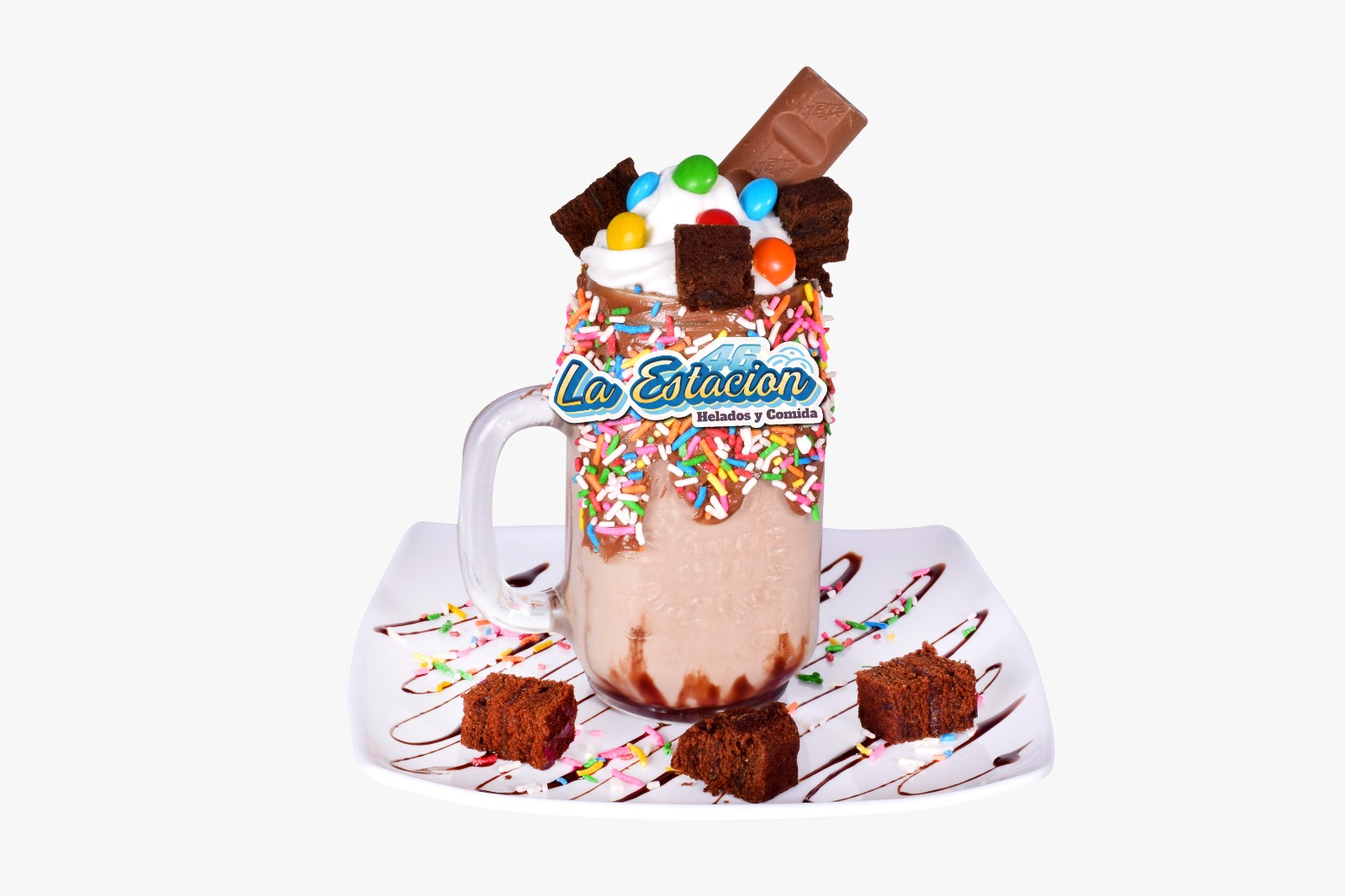 Ingredientes: galleta oreo, piazza, m&m, chantilly, lluvia de colores, chips de chocolate y 3 sabores de helado.