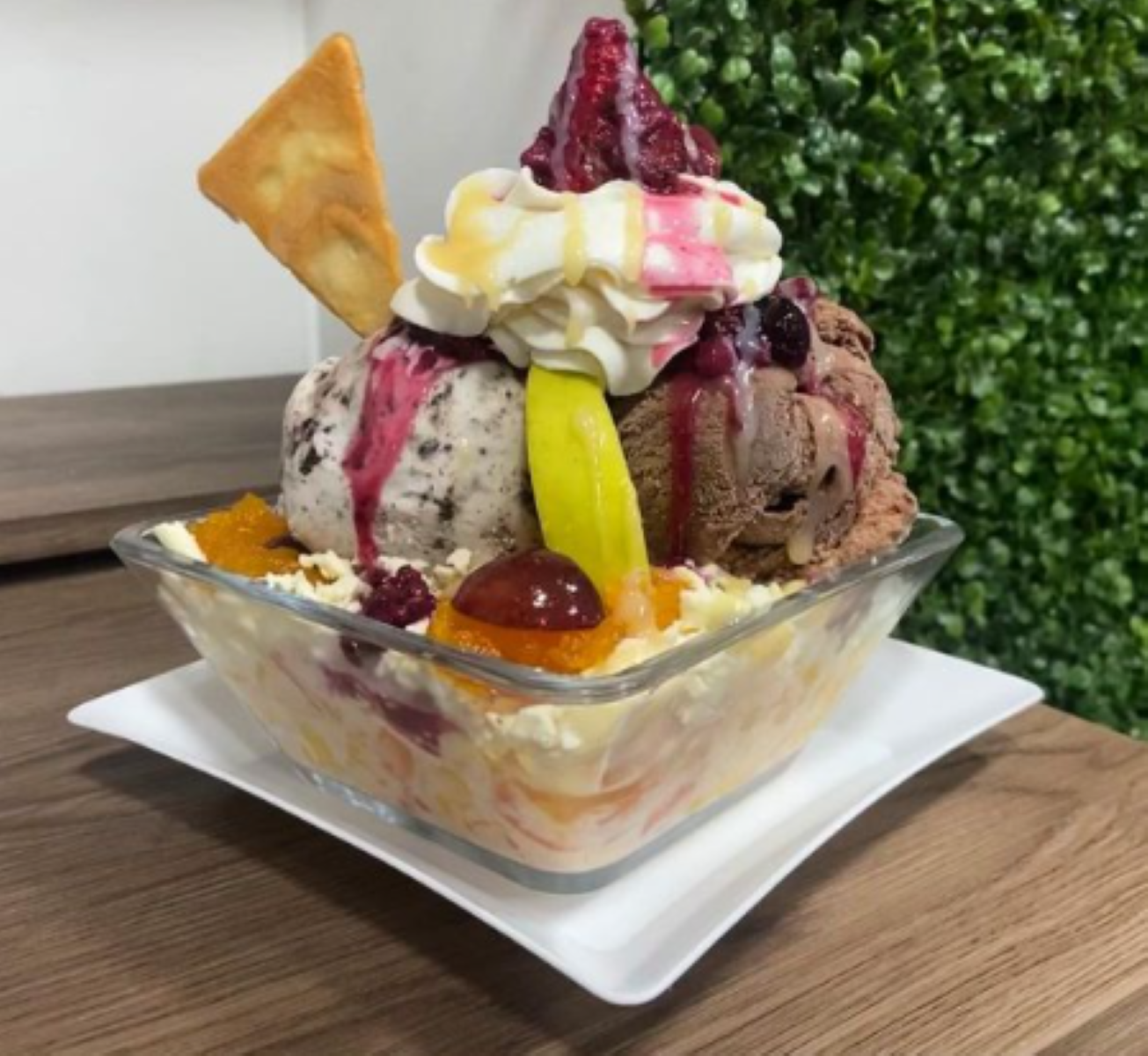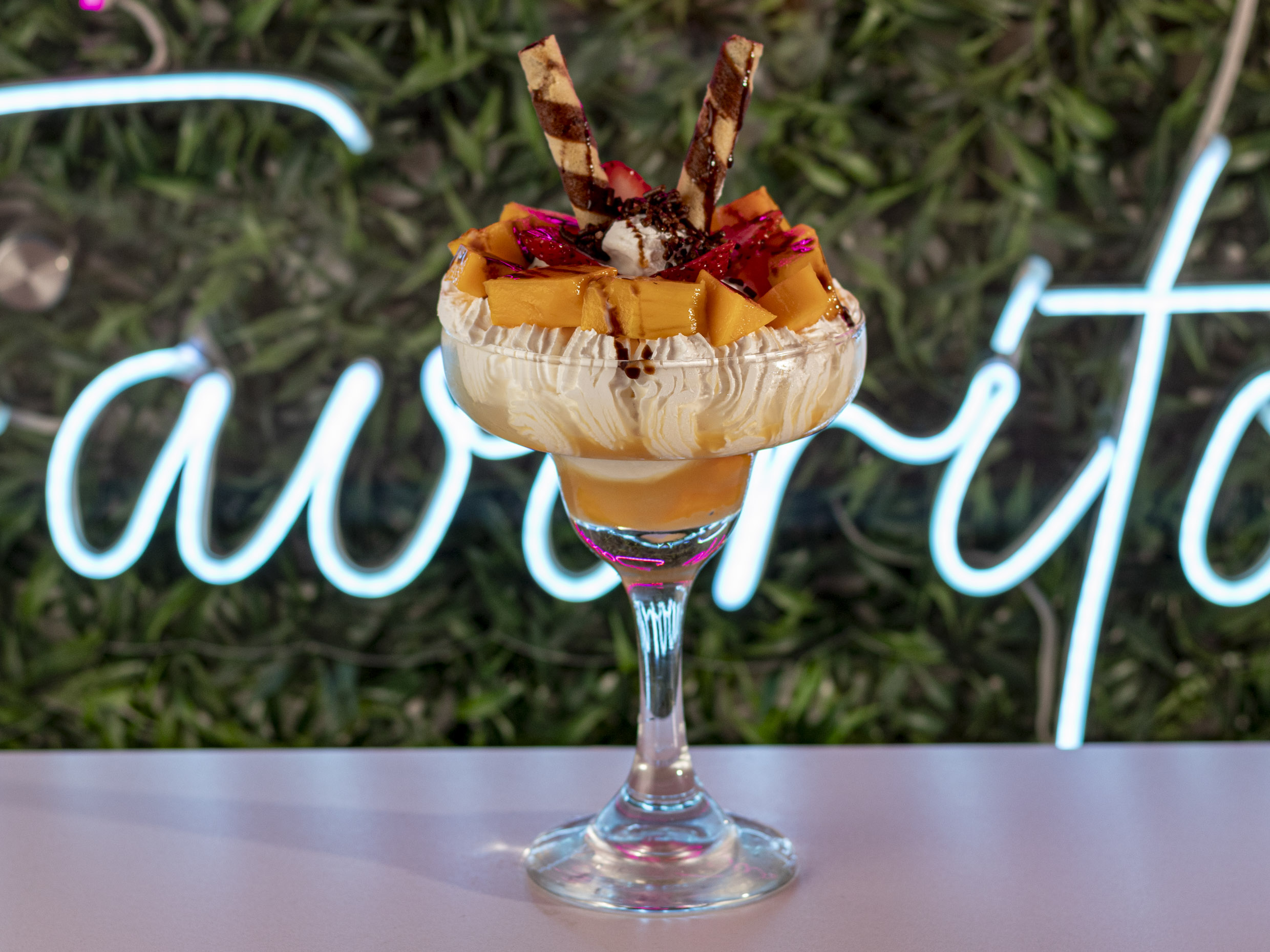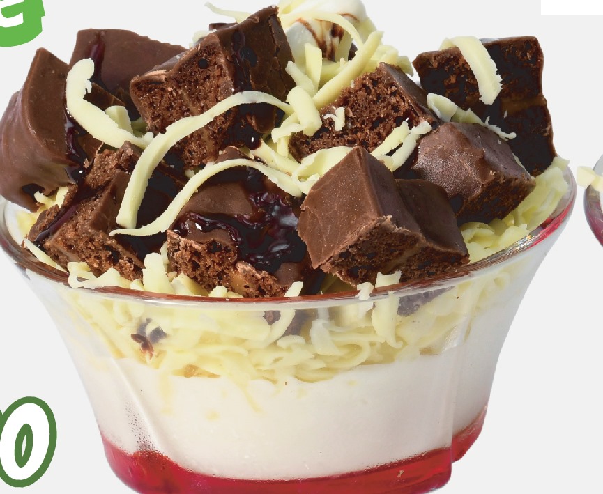 Helado a su elección, mango en trozos, chantillí, fresa, leche condensada, barquillo y lluvia de chocolate.