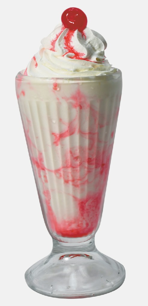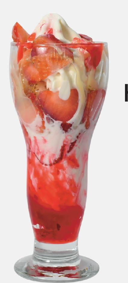 Batido de helado vainilla chips, lluvia de colores, crema chantillí, sirope de fresa, salsa de chocolate Hershey's, barquillo.