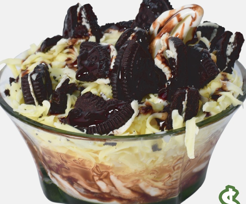 Helado de brownie, crema chantillí, galleta de oreo, lluvia de chocolate y salsa de chocolate.