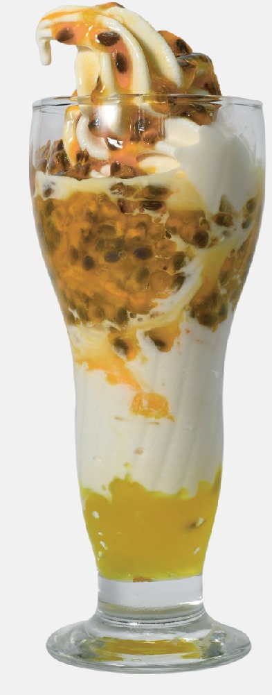 Helado de yogurt, maracuyá, salsa de.maracuya de la casa, glaseado de maracuyá, leche condensada.