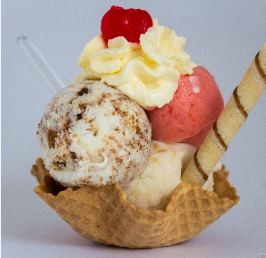 2 Sabores de helado a su elección, salsa de fresa, barquillo, galletas y grageas.
