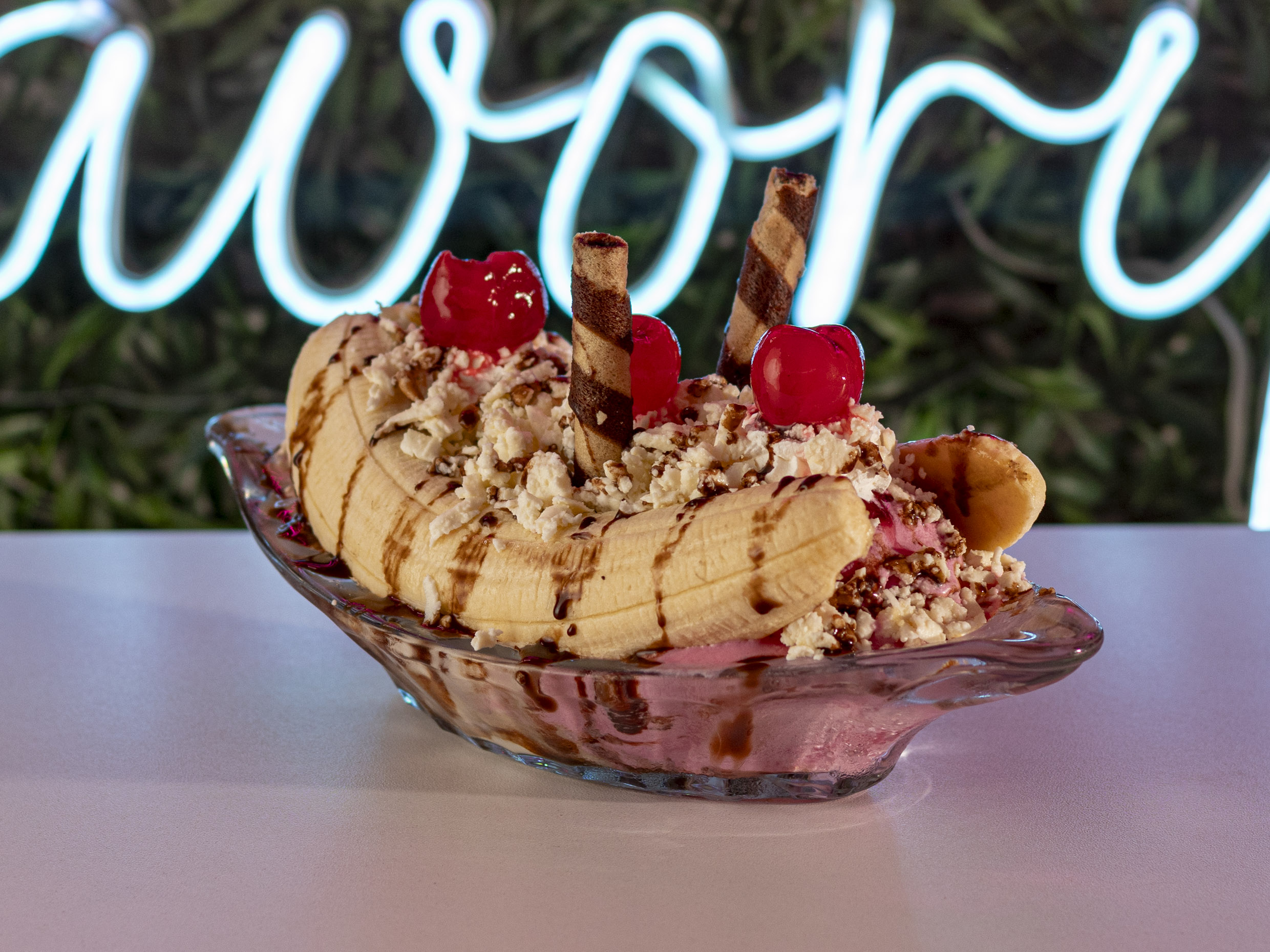 2 banana split con Banano, cereza,3 bolas de helado, barquillo, chantillí, salsa de chocolate y lluvia de chocolate, leche con condensada y queso.
