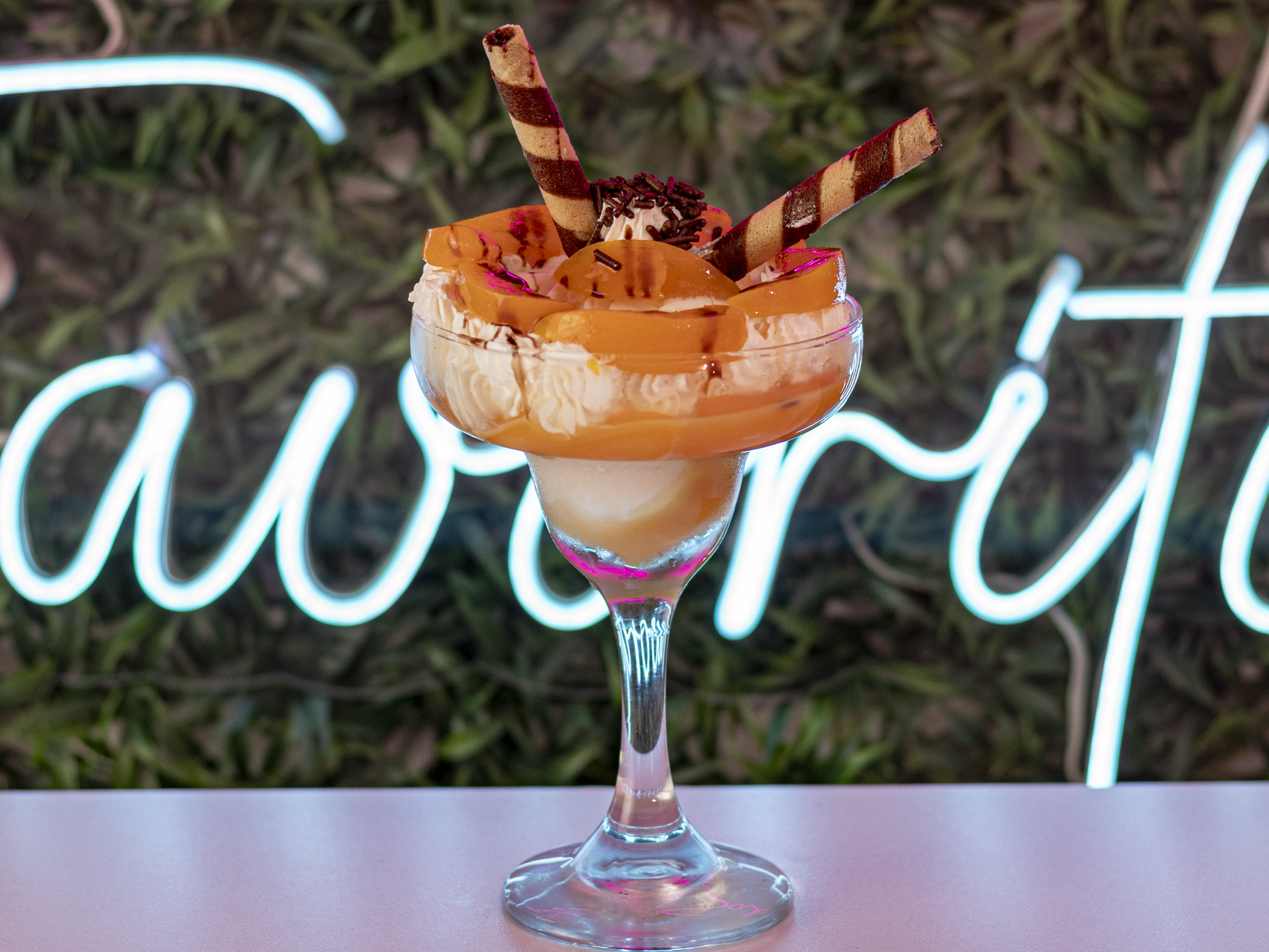 Helado a su elección, durazno, chantillí, barquillo y salsa de chocolate.