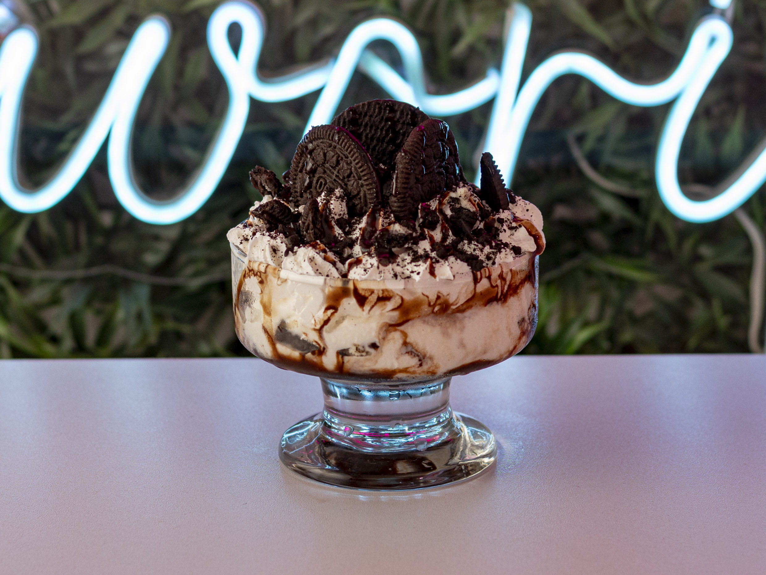 Helado de yogurt, queso, leche condensada, Oreo, salsa de chocolate.