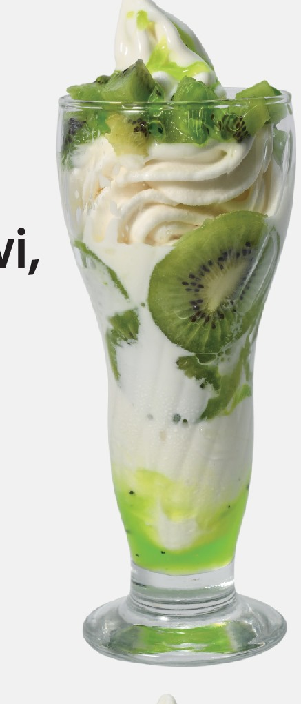 Helado de yogurt, kiwi, salsa de kiwi de la casa, glaseado de kiwi, leche condensada.