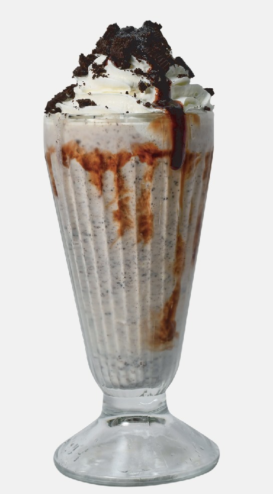 Batido de helado de chocolate, salsa de chocolate Hershey's, crema chantillí, trozos de chocolatina, barquillo, lluvia de chocolate.