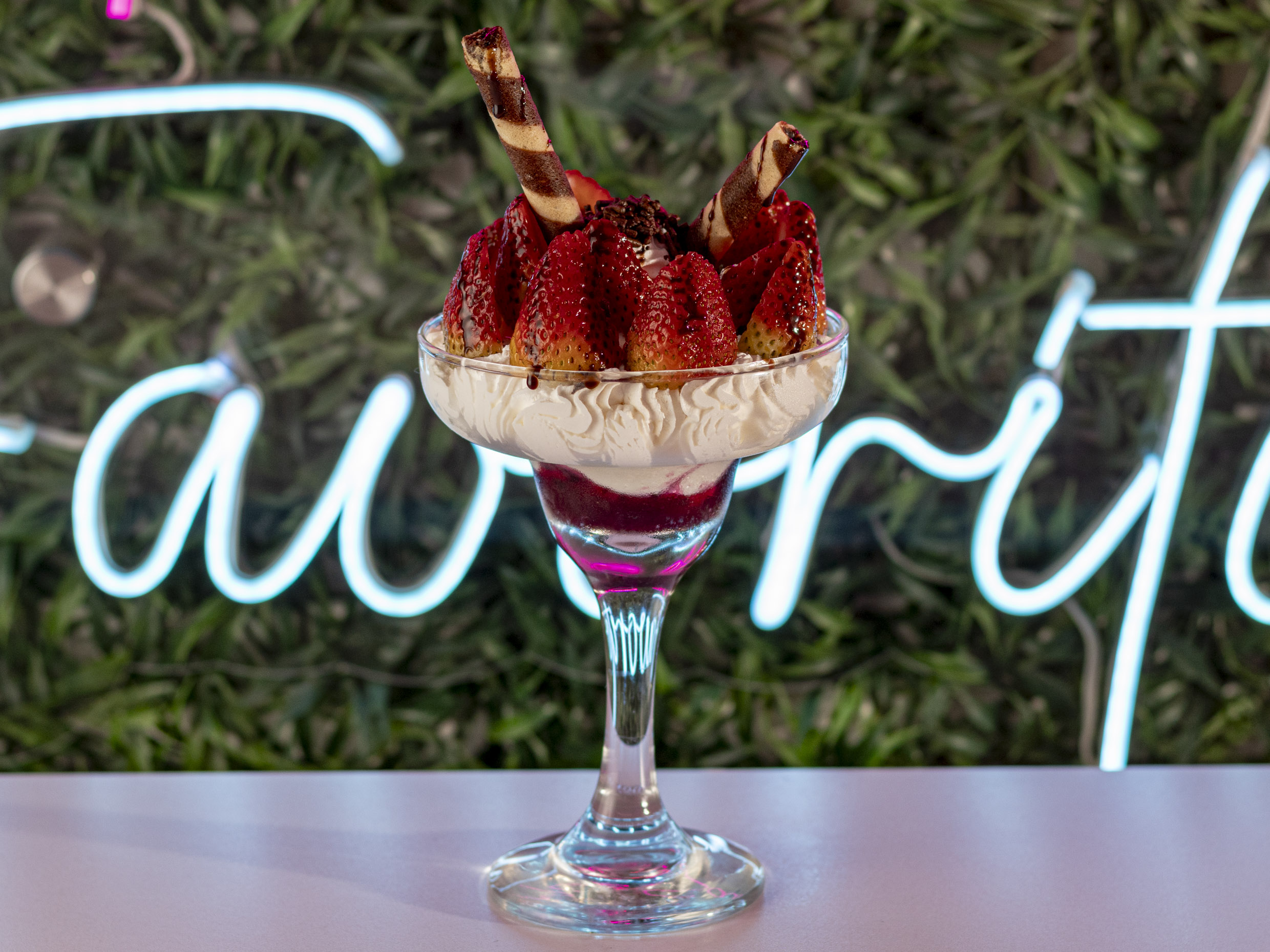 Helado de fresa, crema chantillí, salsa de fresa, lluvia de chocolate y barquillo.