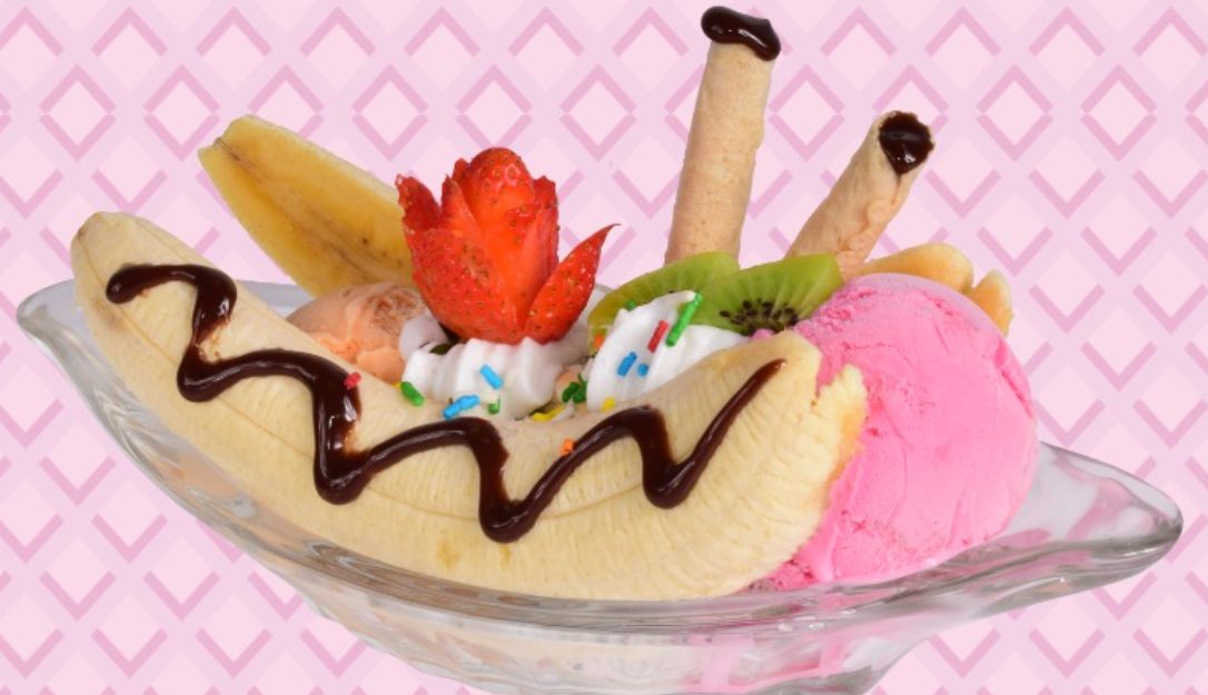 Banano, crema de la casa, 3 bolas de helado a elección, queso, salsa de chocolate, arequipe, barquillo.