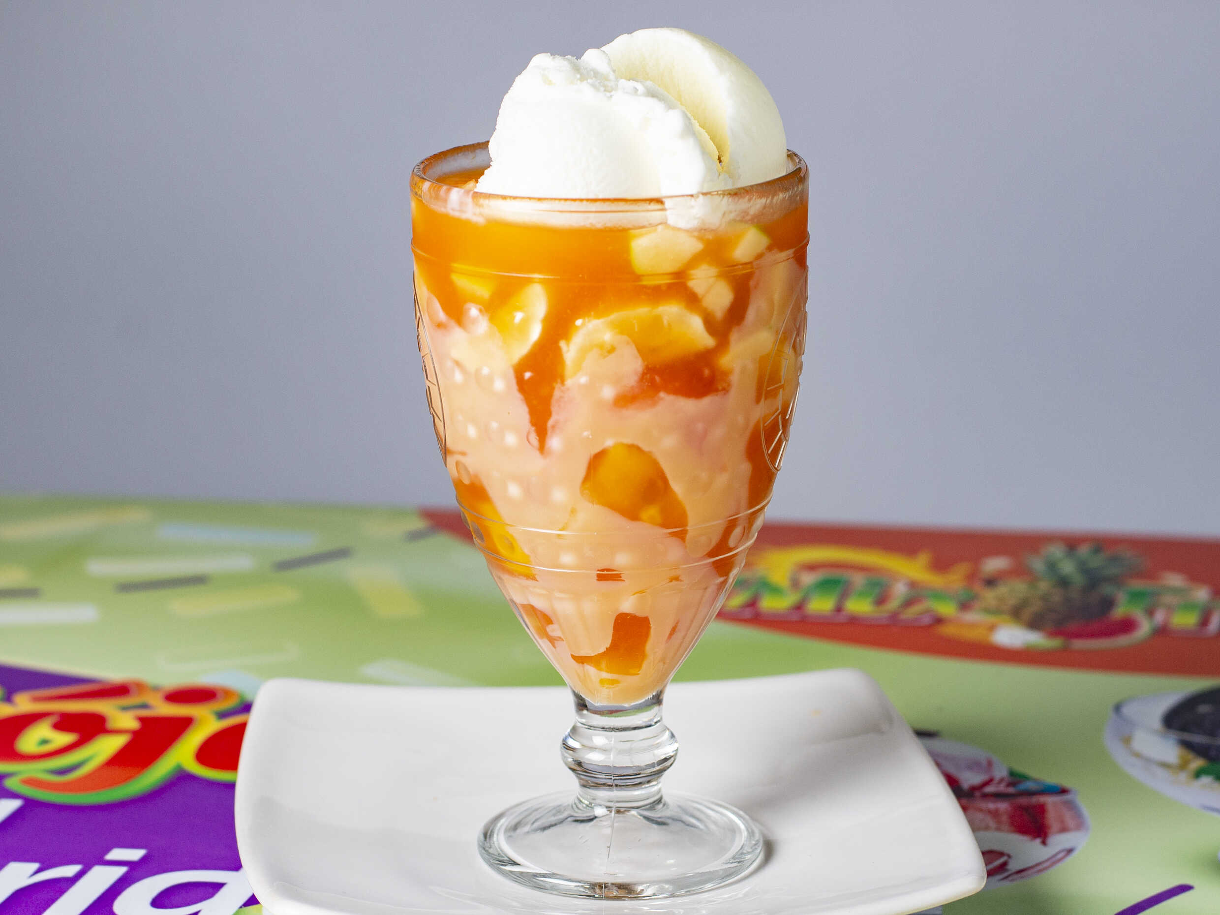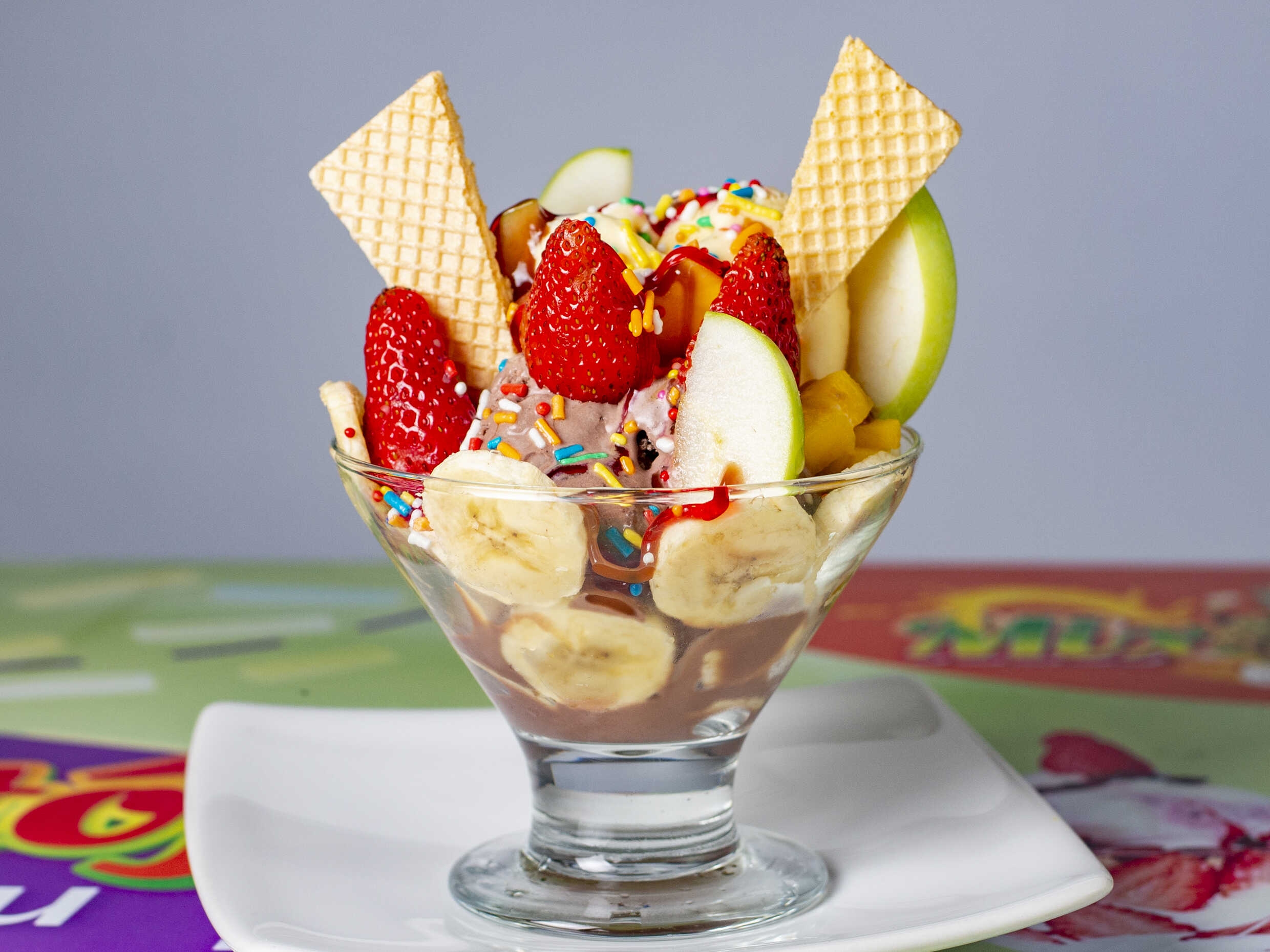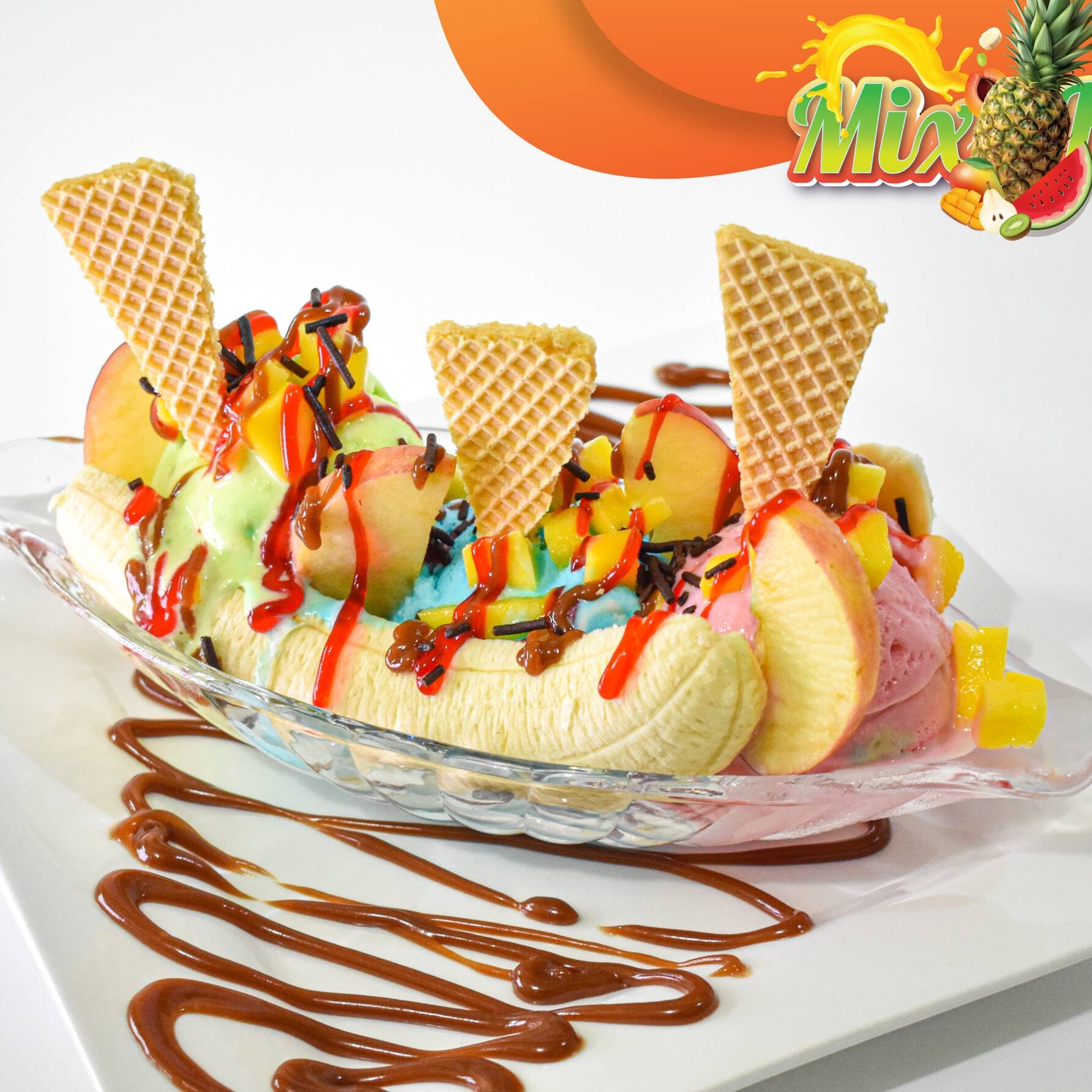 2 Bolas de helado a tu elección, banano y mango, salsa chocolate y toppings.