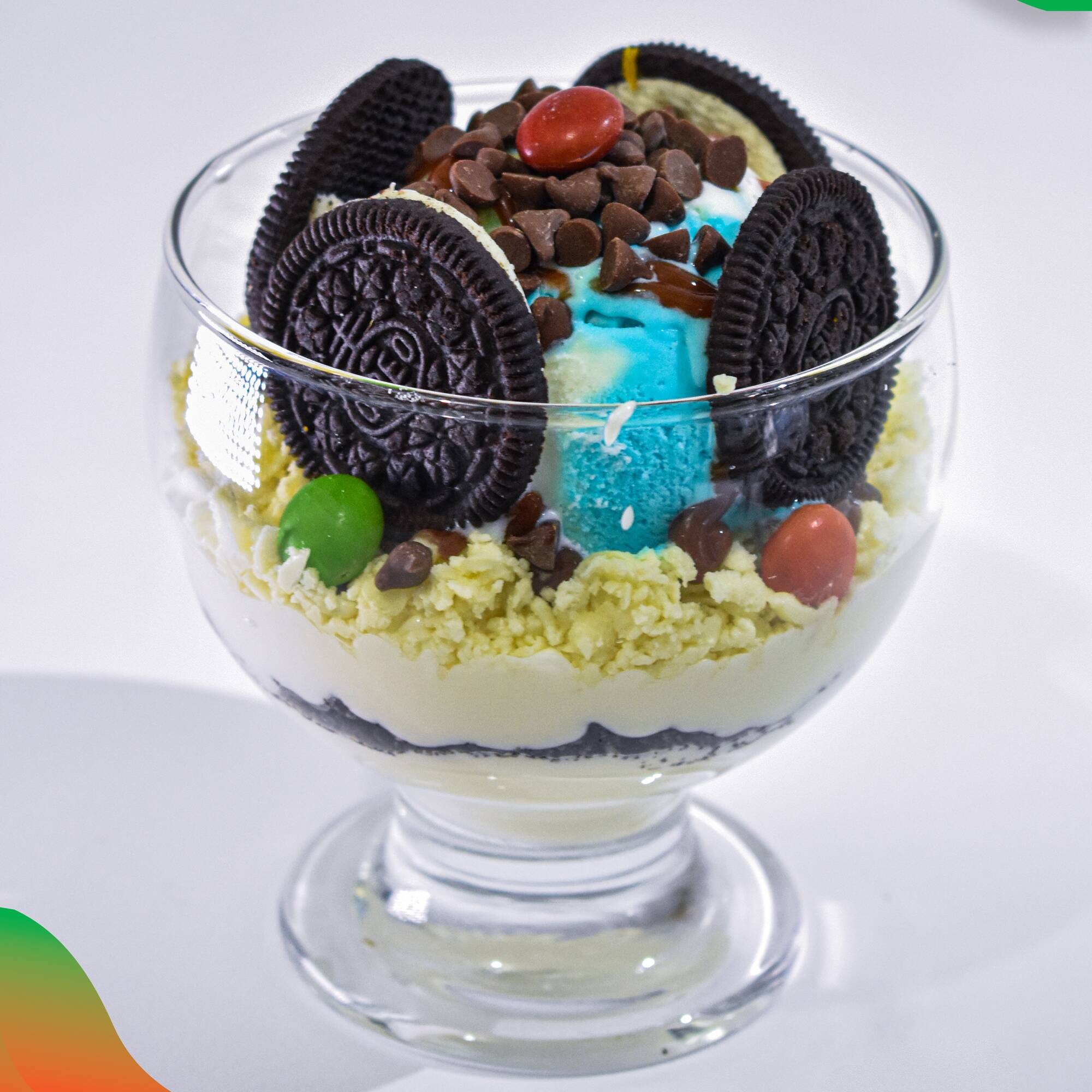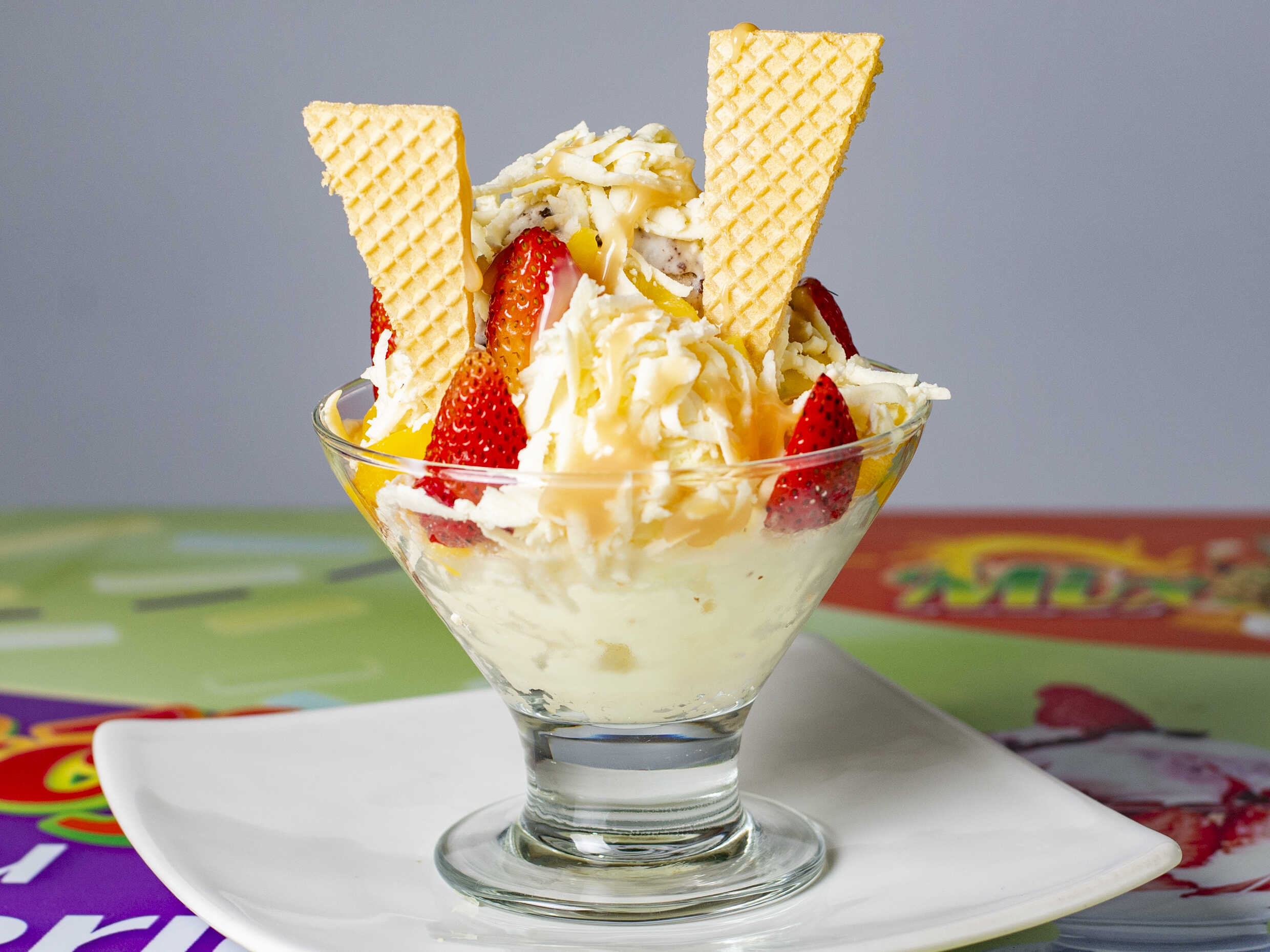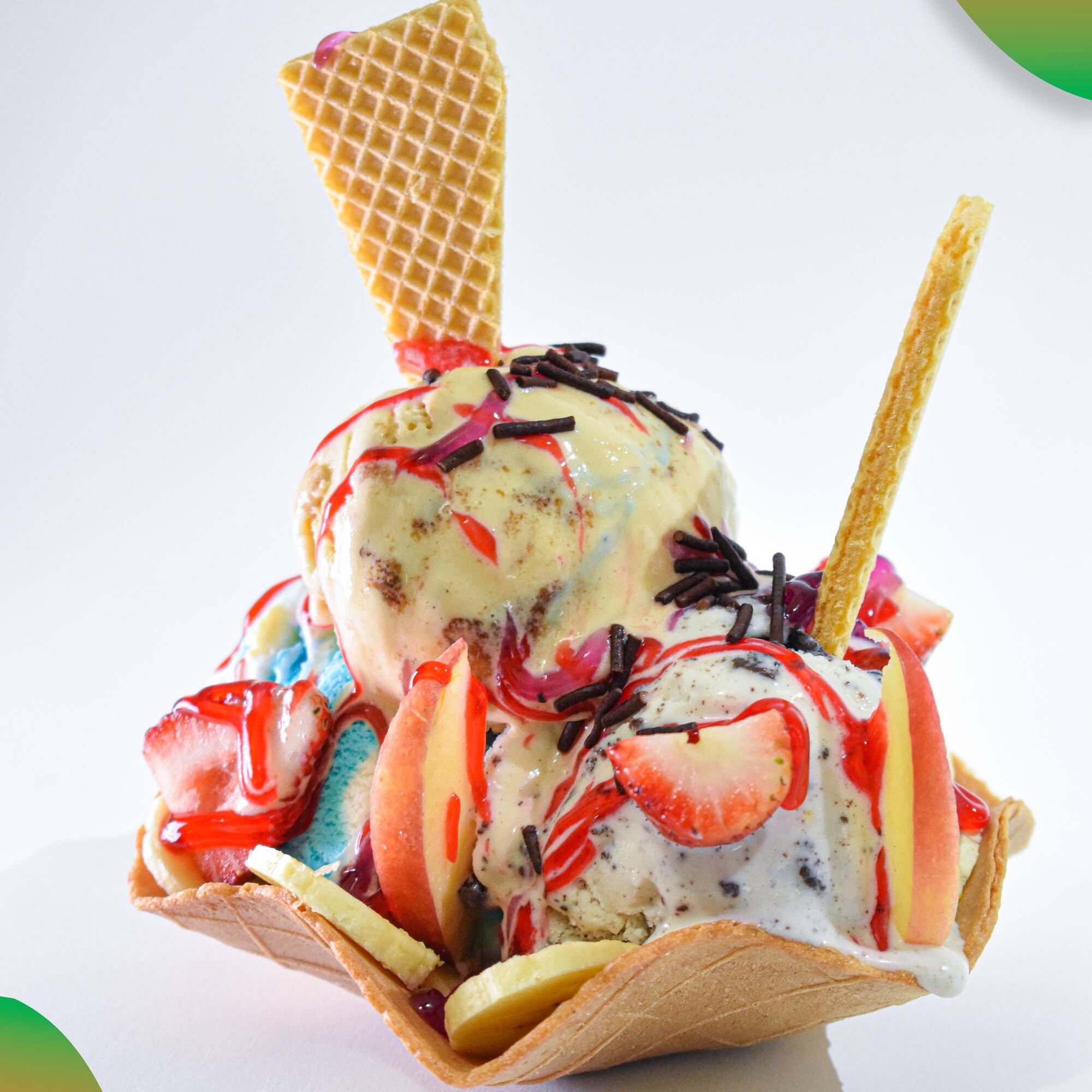 2 Bolas de helado a tu elección, banano, mango, galleta y toppings.