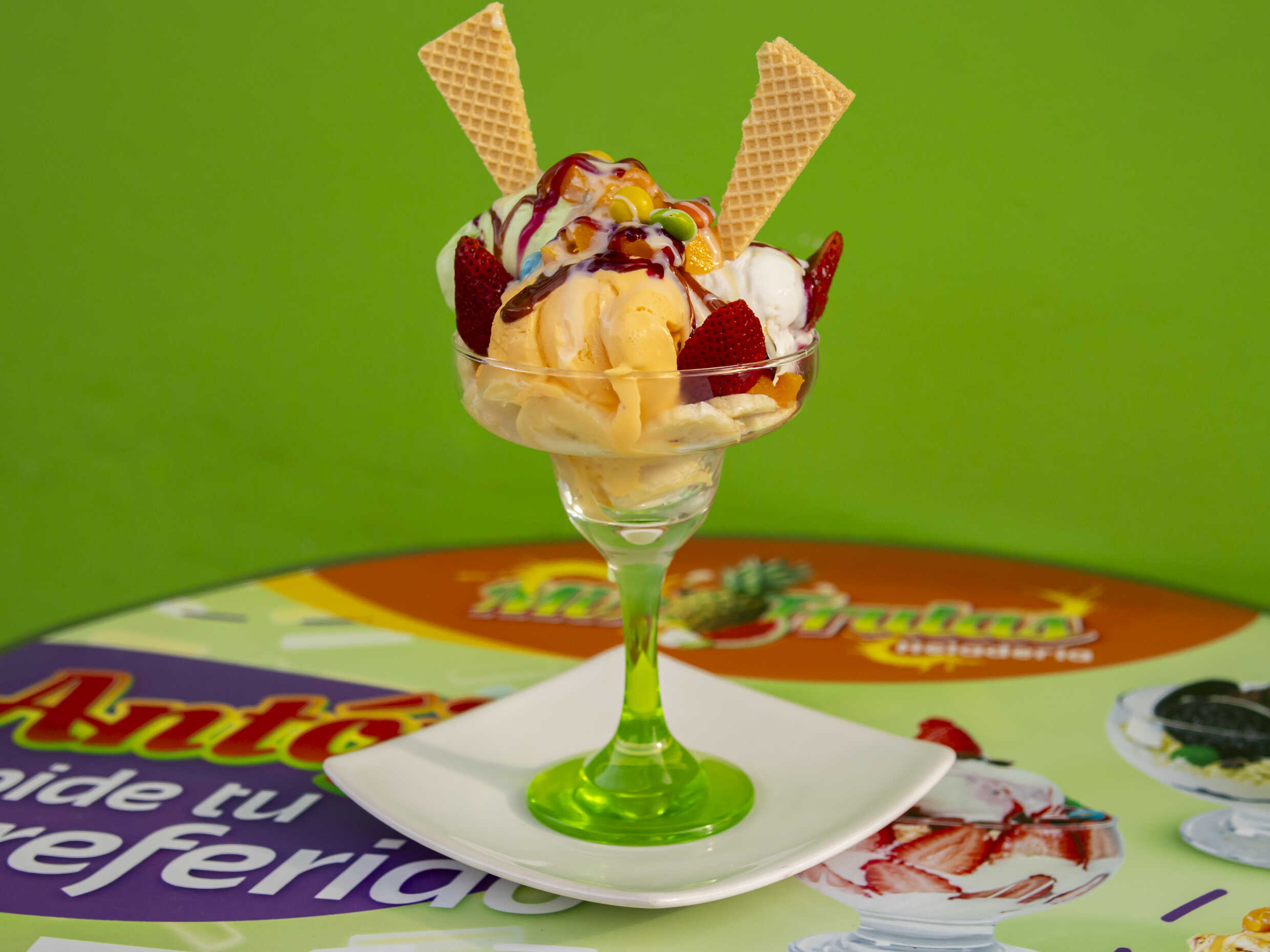 Banano, papaya, mango, kiwi, piña, queso, crema de leche, tres bolas de helado a tu elección.