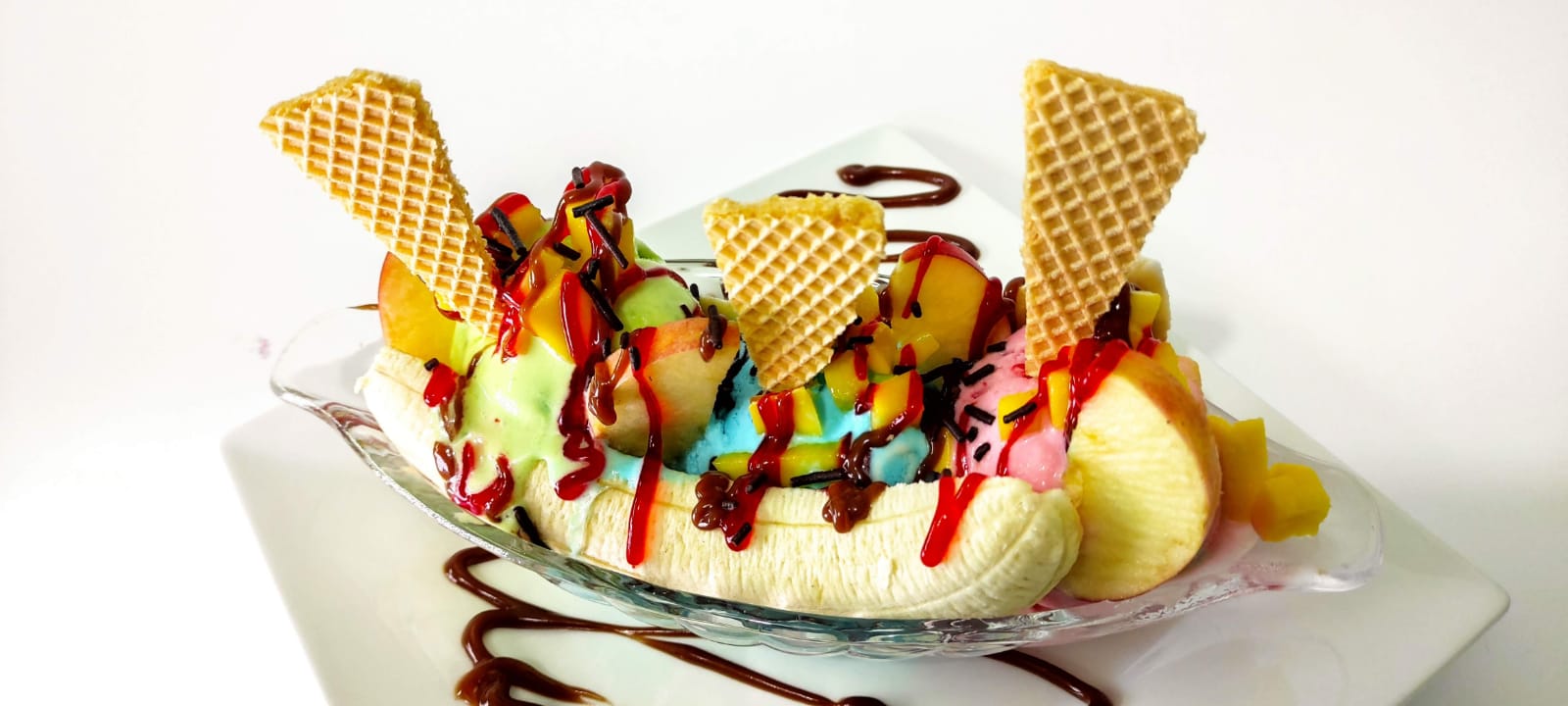 Banano, 3 bolas de helado a tu elección, salsa de chocolate, toppings, queso.