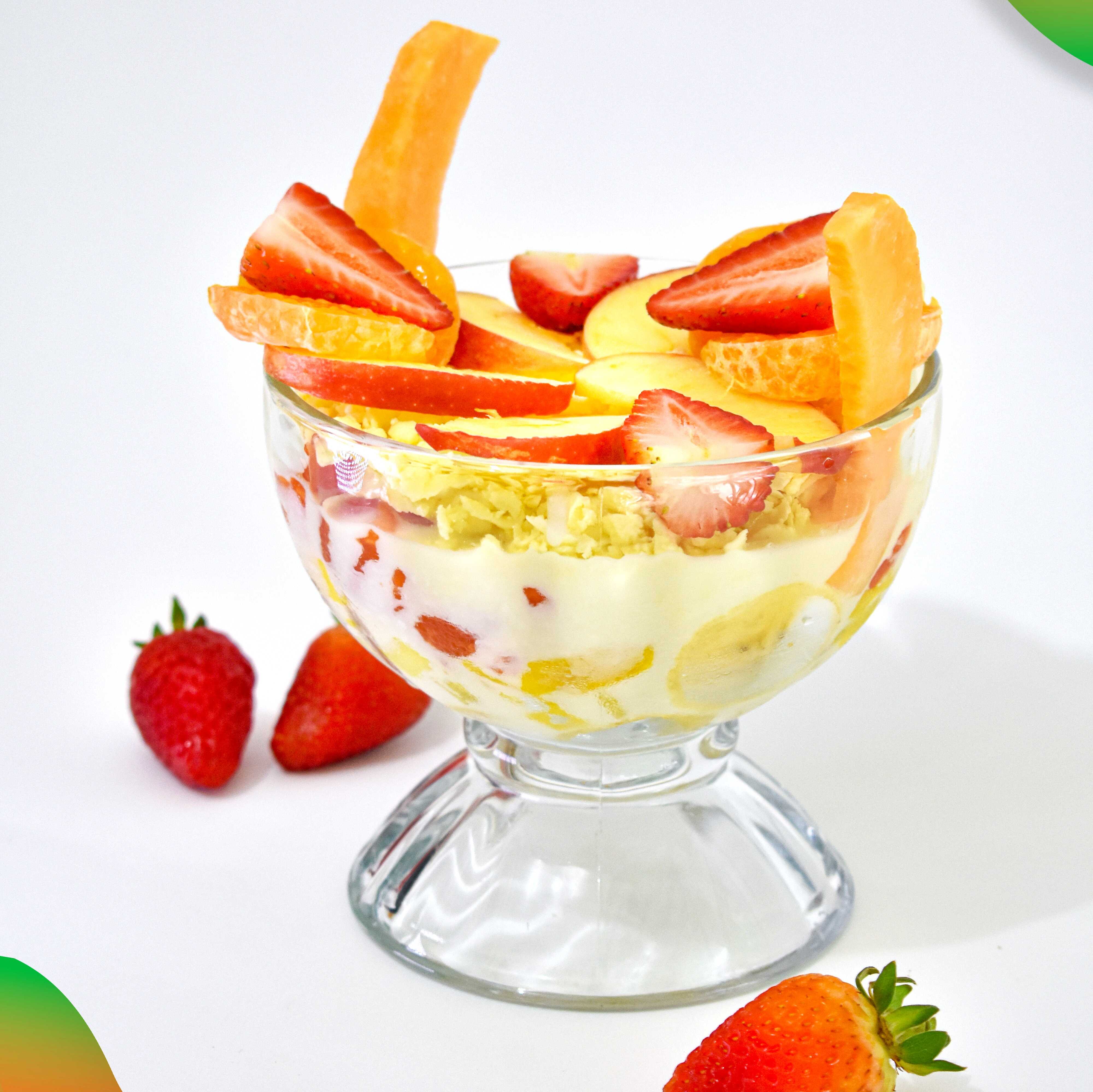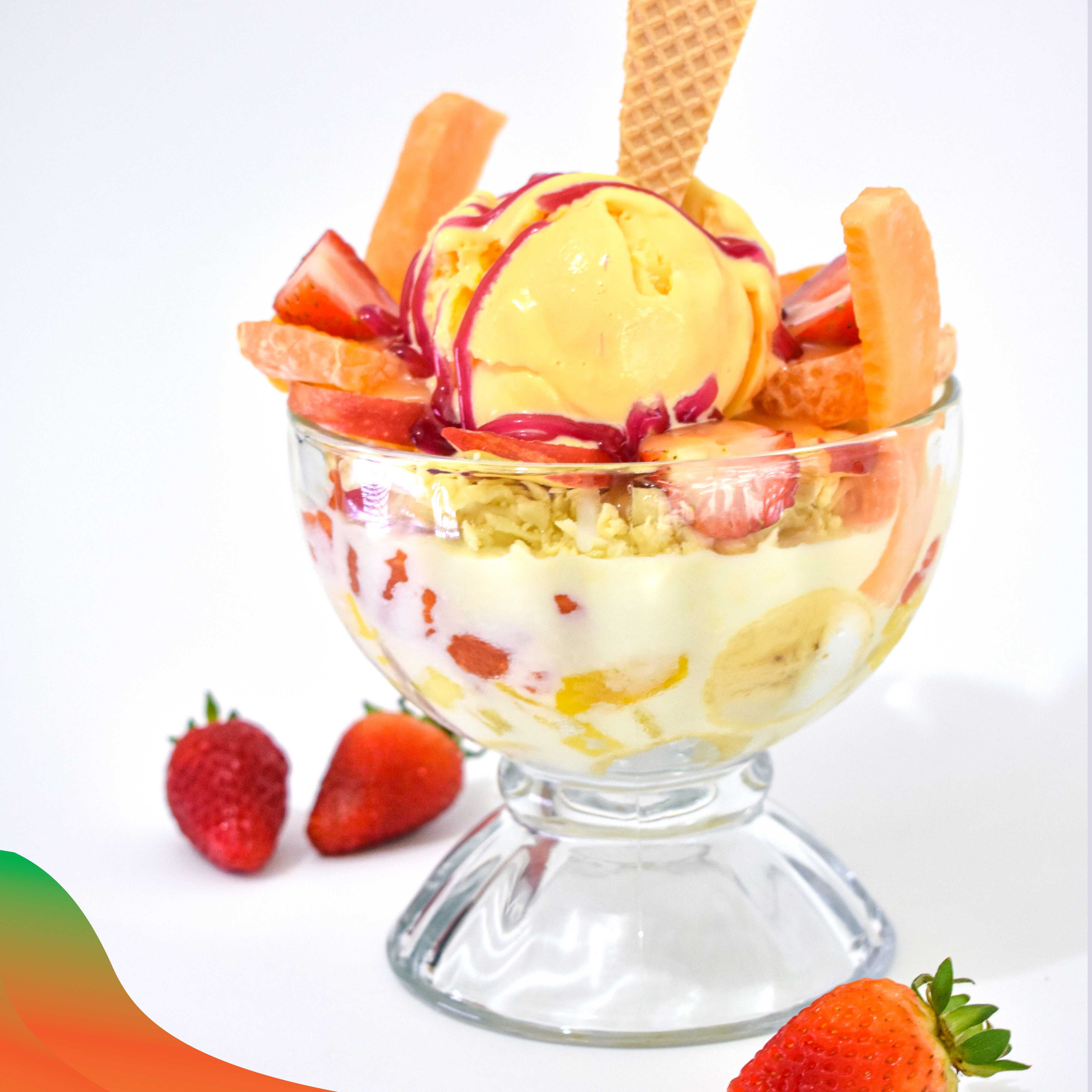 Banano, papaya, mango, kiwi, piña, queso, crema de leche, una bola de helado a tu elección.