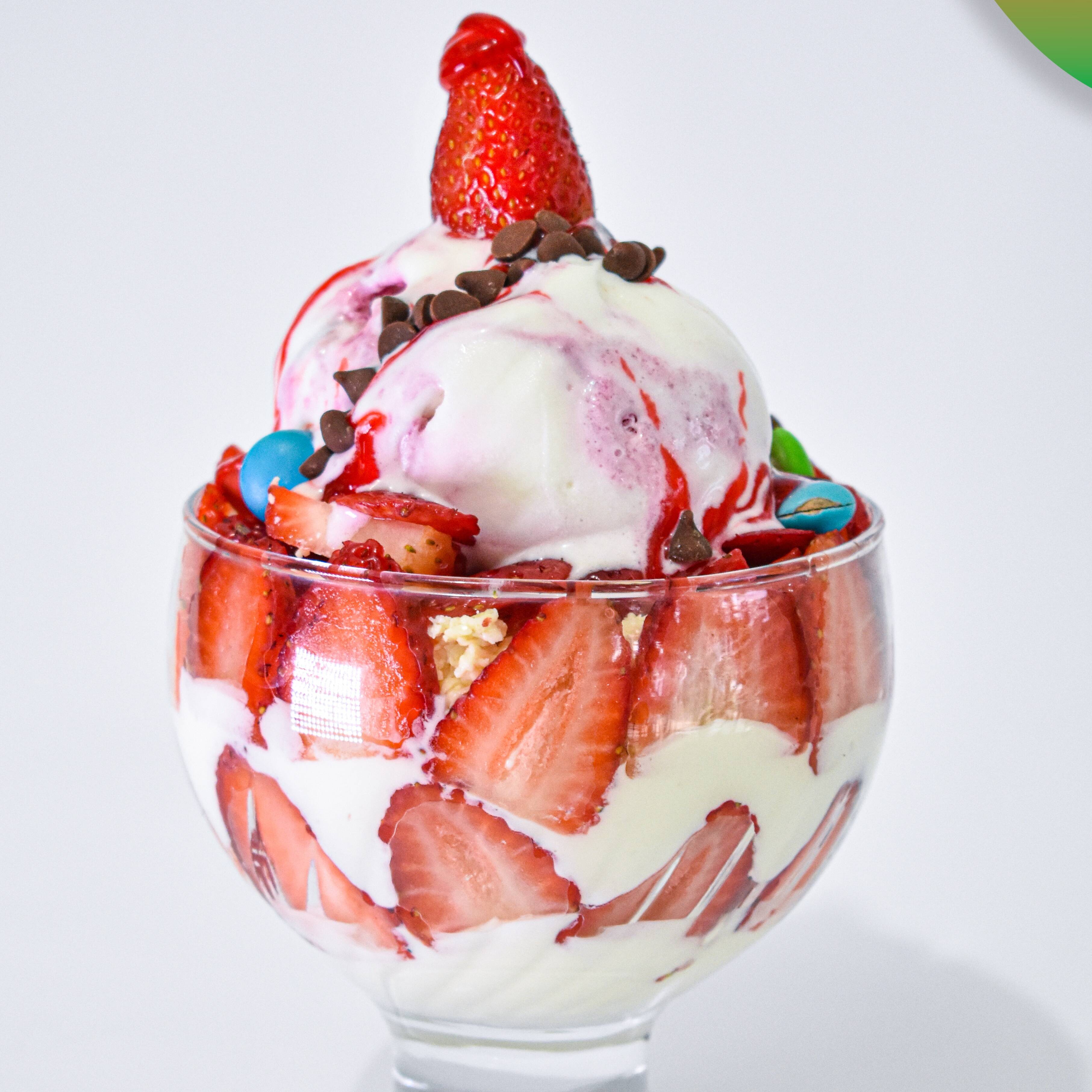 Fresas en trozos, queso, crema de la casa, helado a elección y toppings.