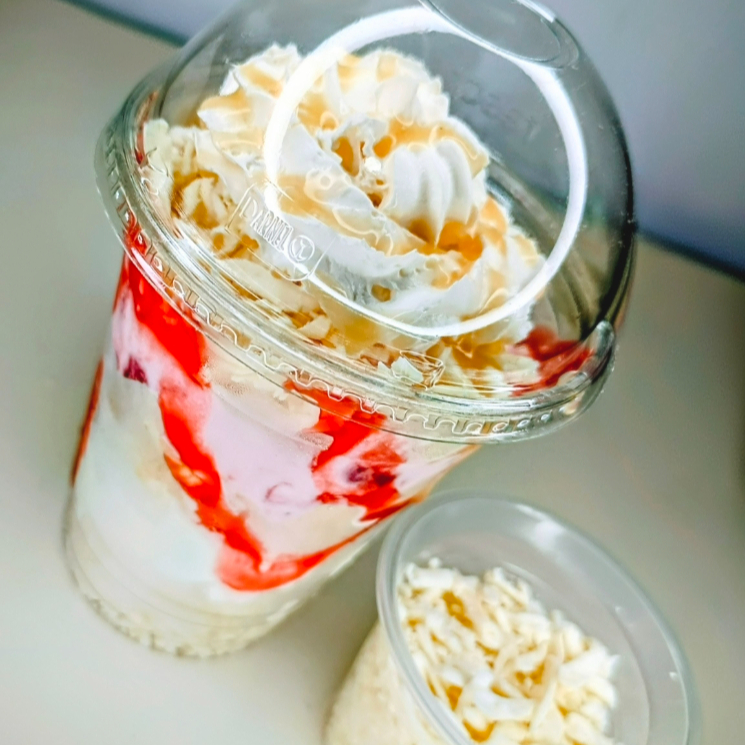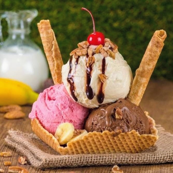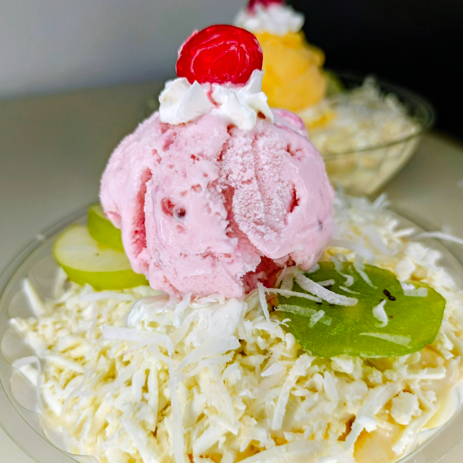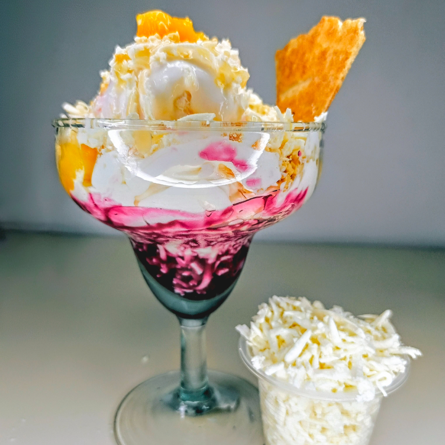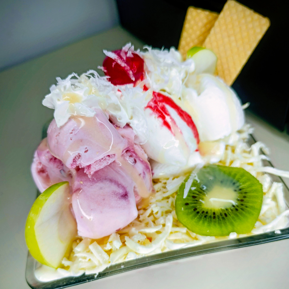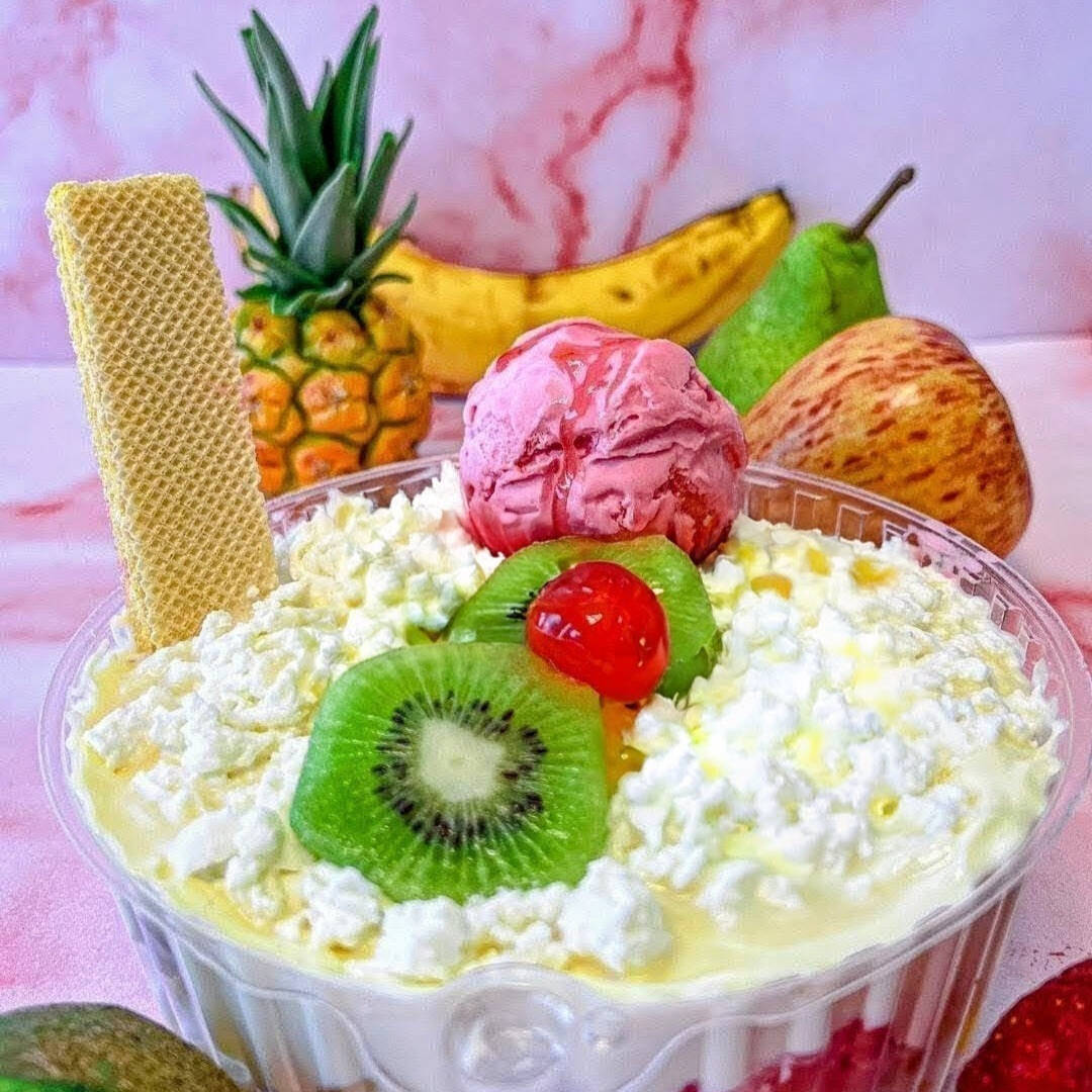 Mix de frutas frescas, queso, salsa cremosa de la casa, galletas, kiwi, cereza, lechera, crema de leche Chantilly,coco y dos sabores de helado.