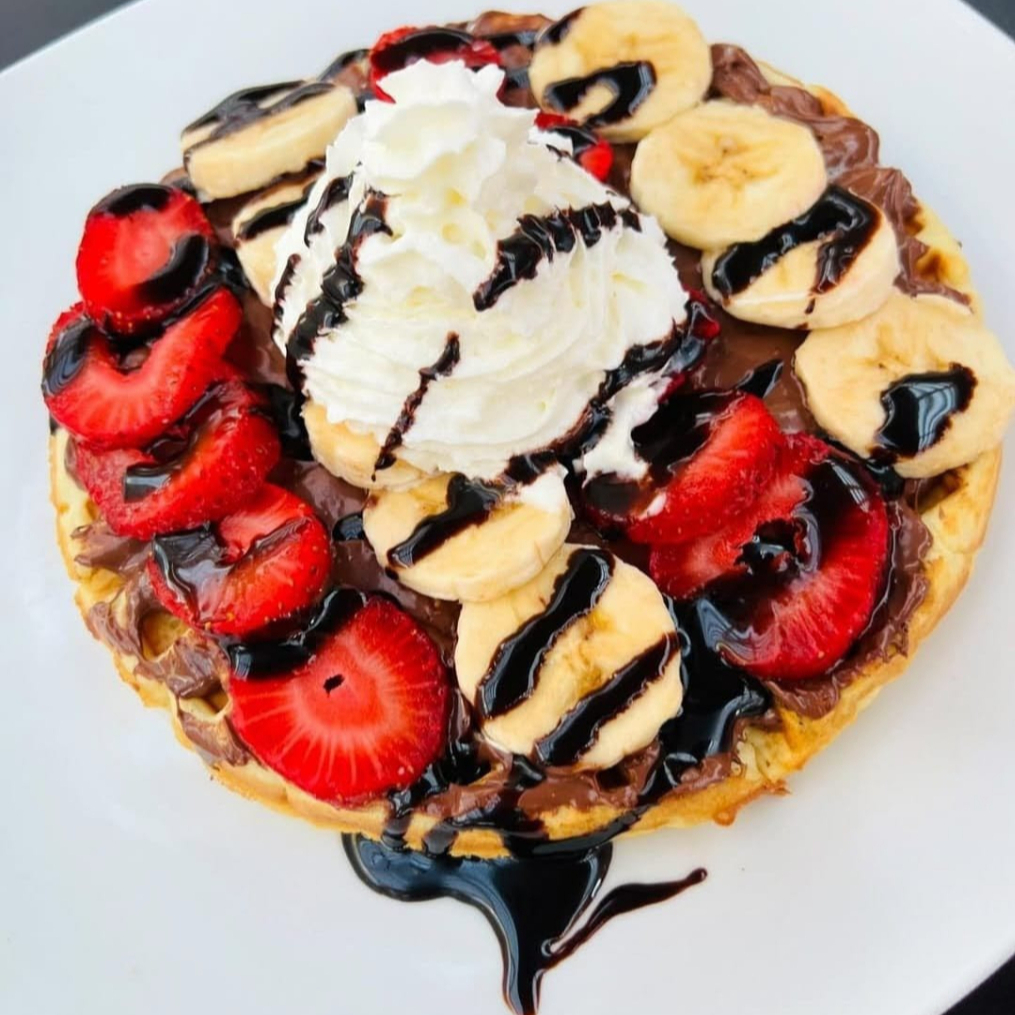 Waffle Tropical acompañado de mix frutas frescas ,crema de leche , 1 bola de helado y salsa de chocolate.