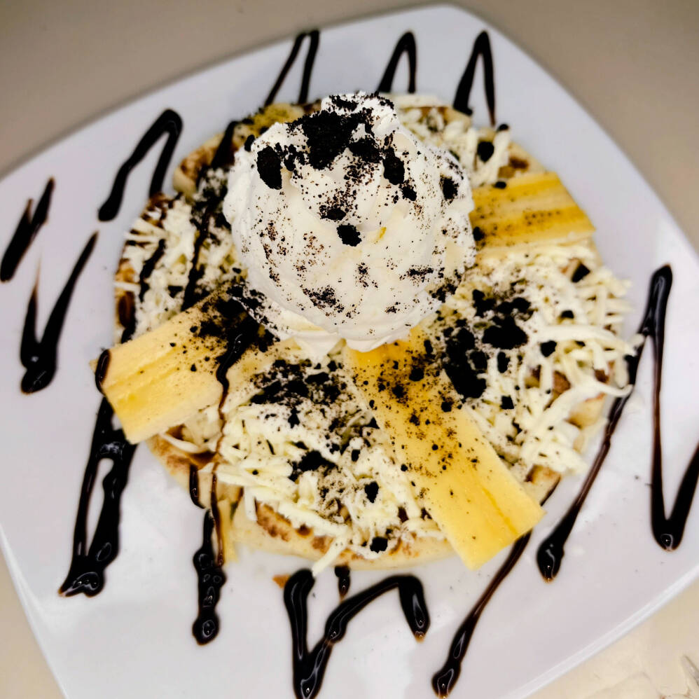 Waffle con queso , banano ,1 toping , 1 bola de helado y salsa de chocolate.