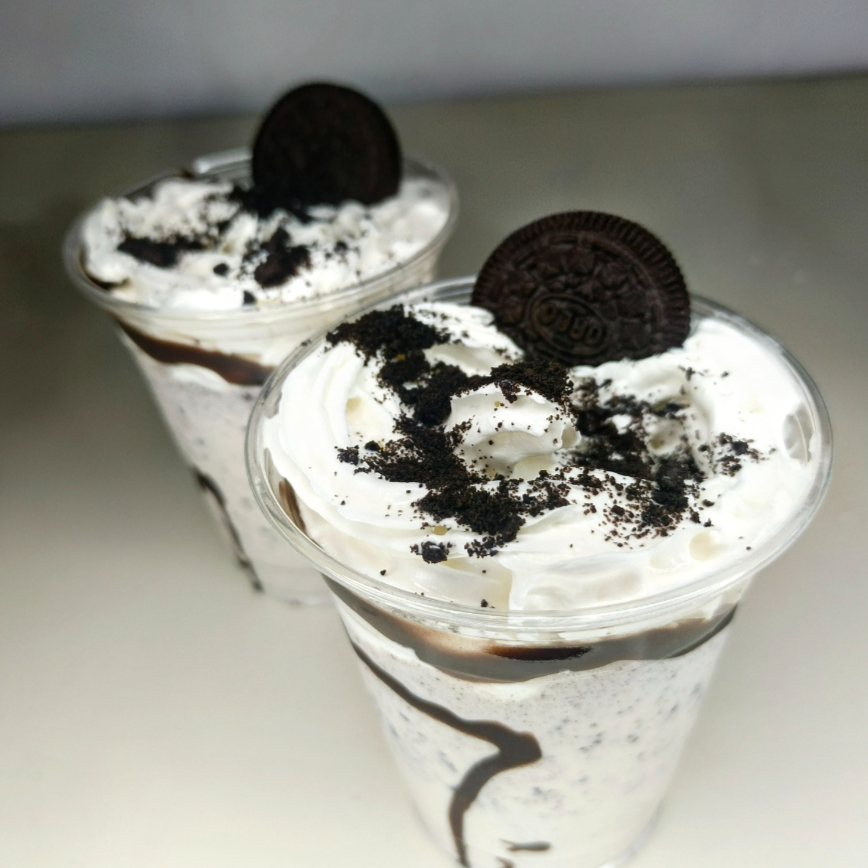 Nuestra copa Oreo trae dos sabores de helado, galletas oreo, oreo pulverizada, Chantilly y cereza.