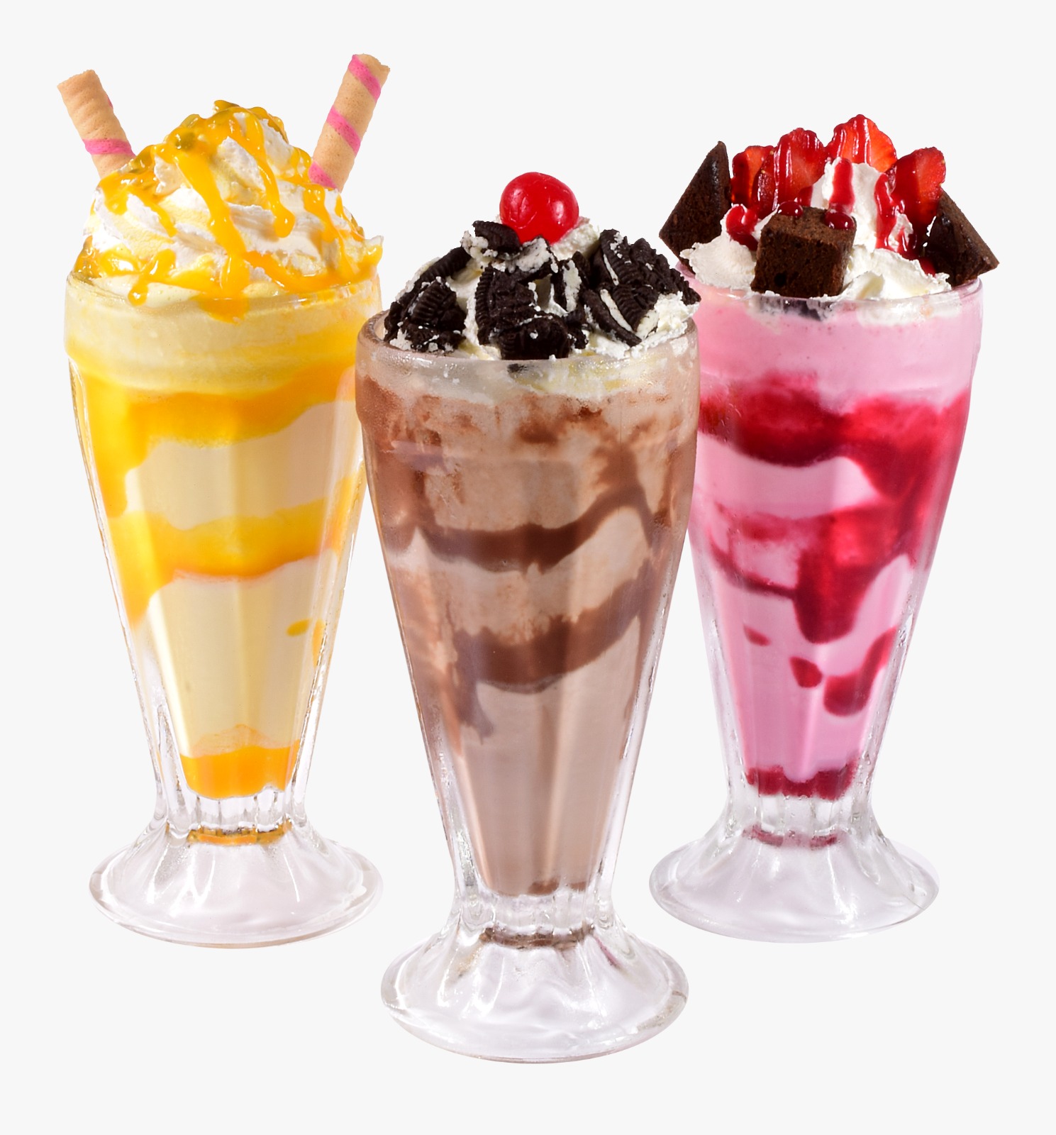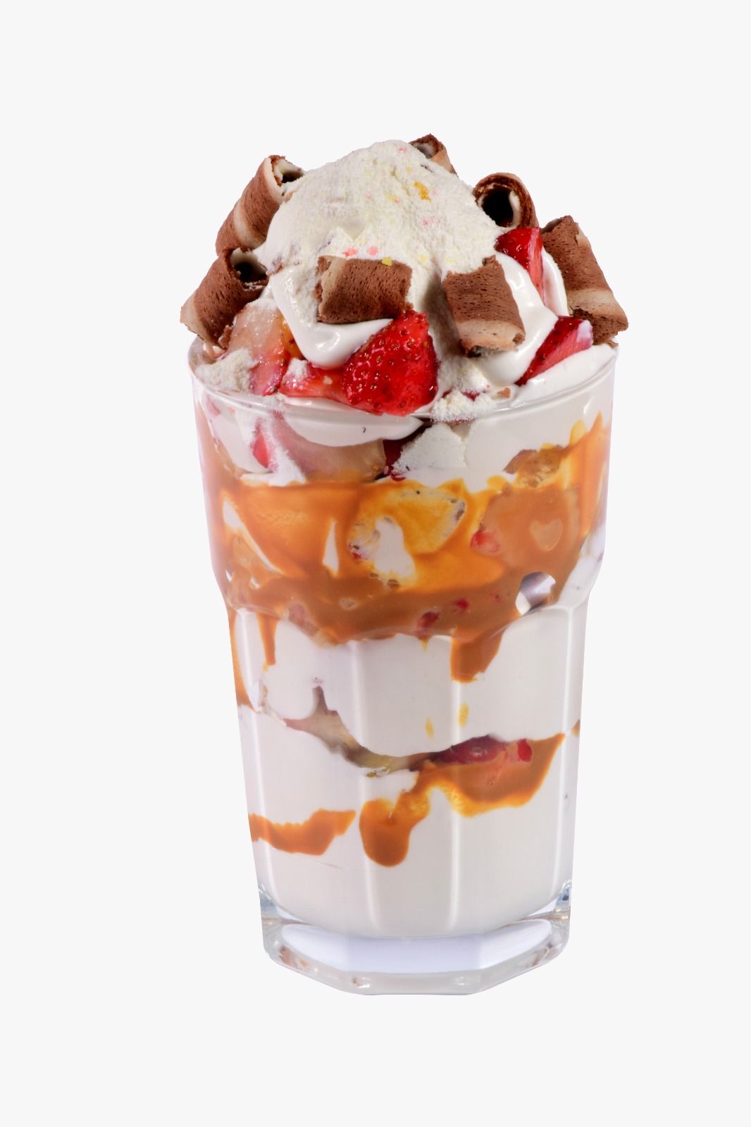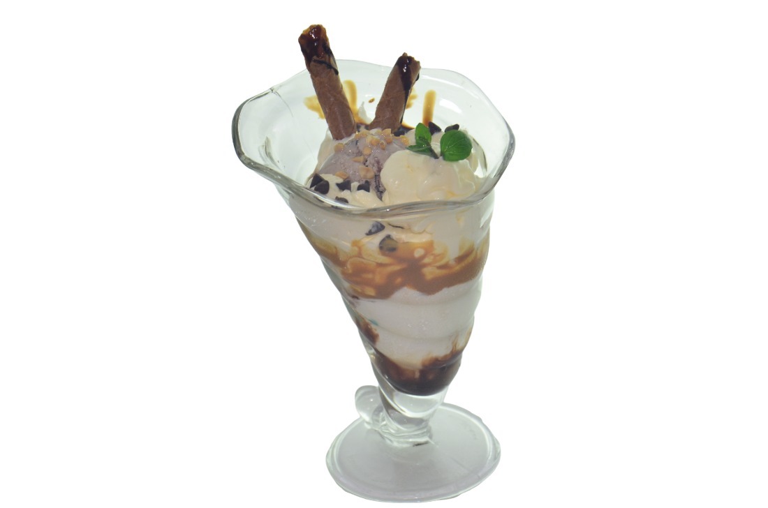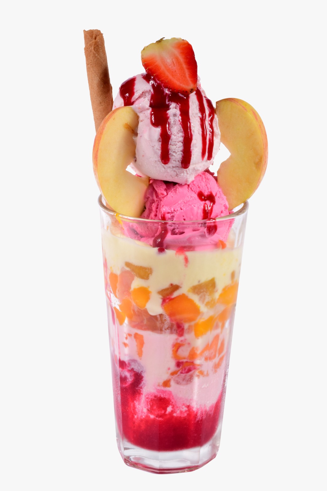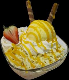 Tres sabores de helado, variedad de frutas, crema de leche, salsa de fresa, barquillo.