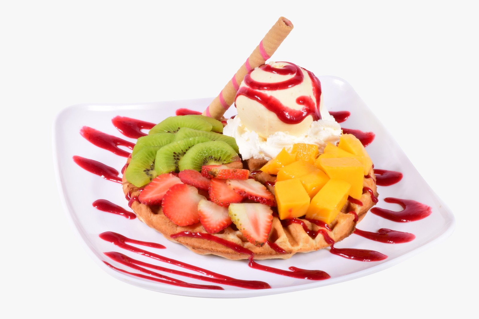 Waffle con helado, fresa, kiwi, durazno, salsa y chantilly.