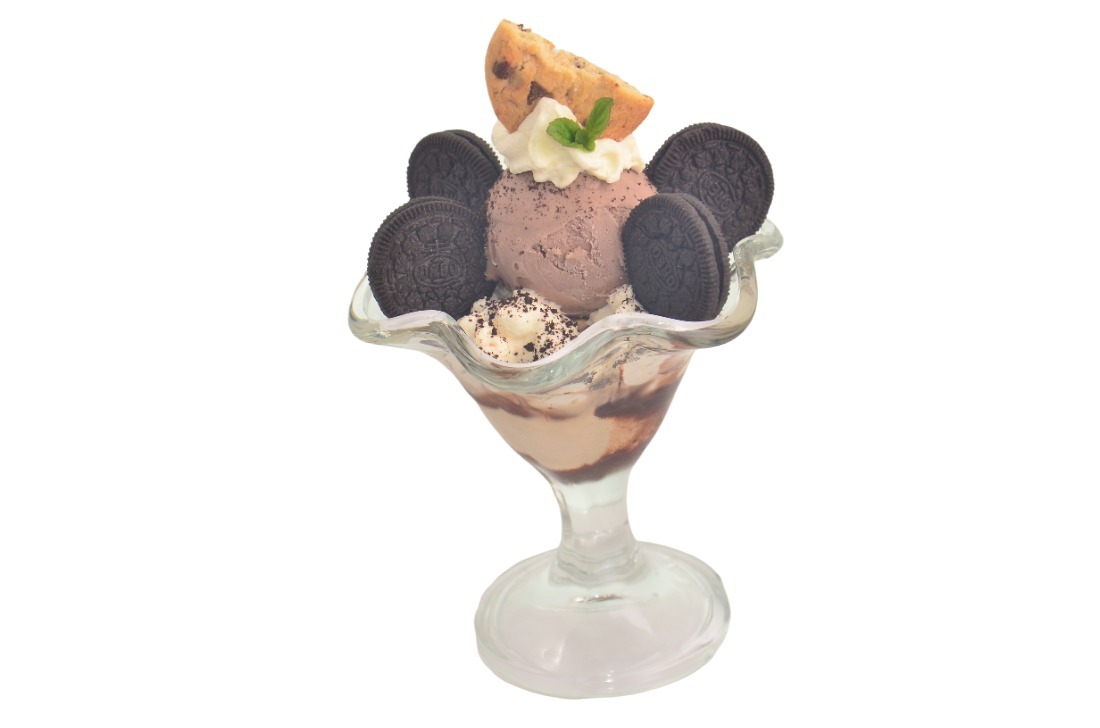 Tres sabores de helado, crema de whisky, salsa de chocolate, chantilly y galleta.