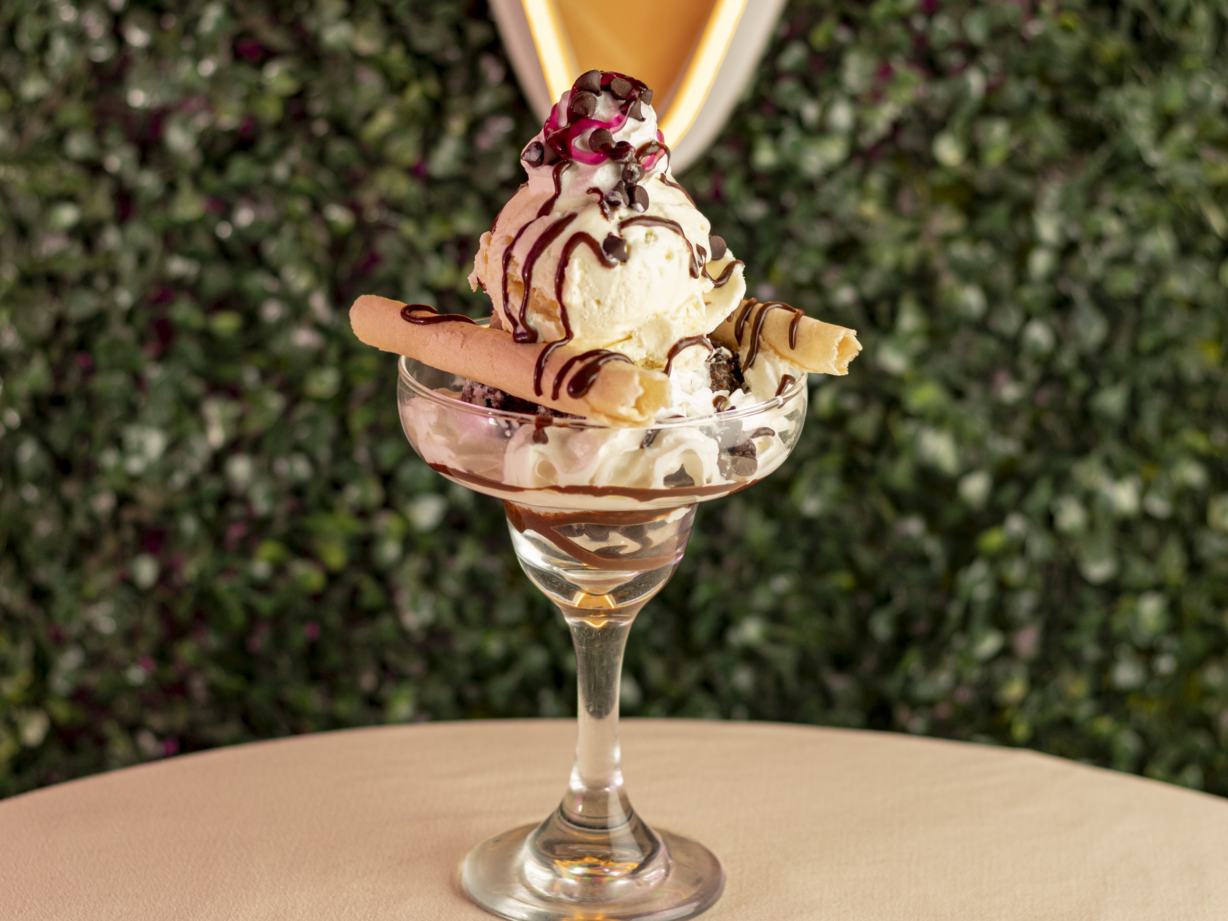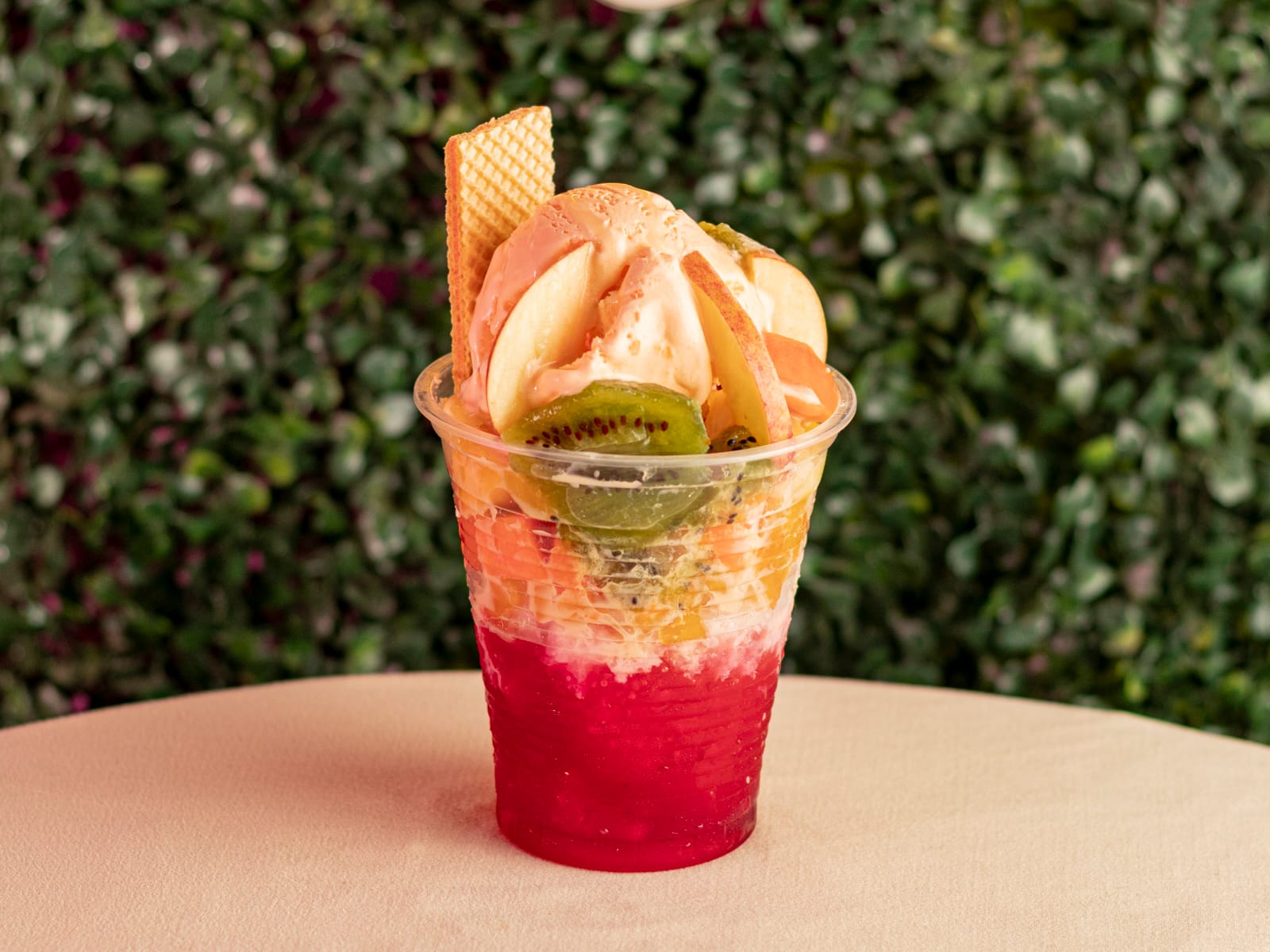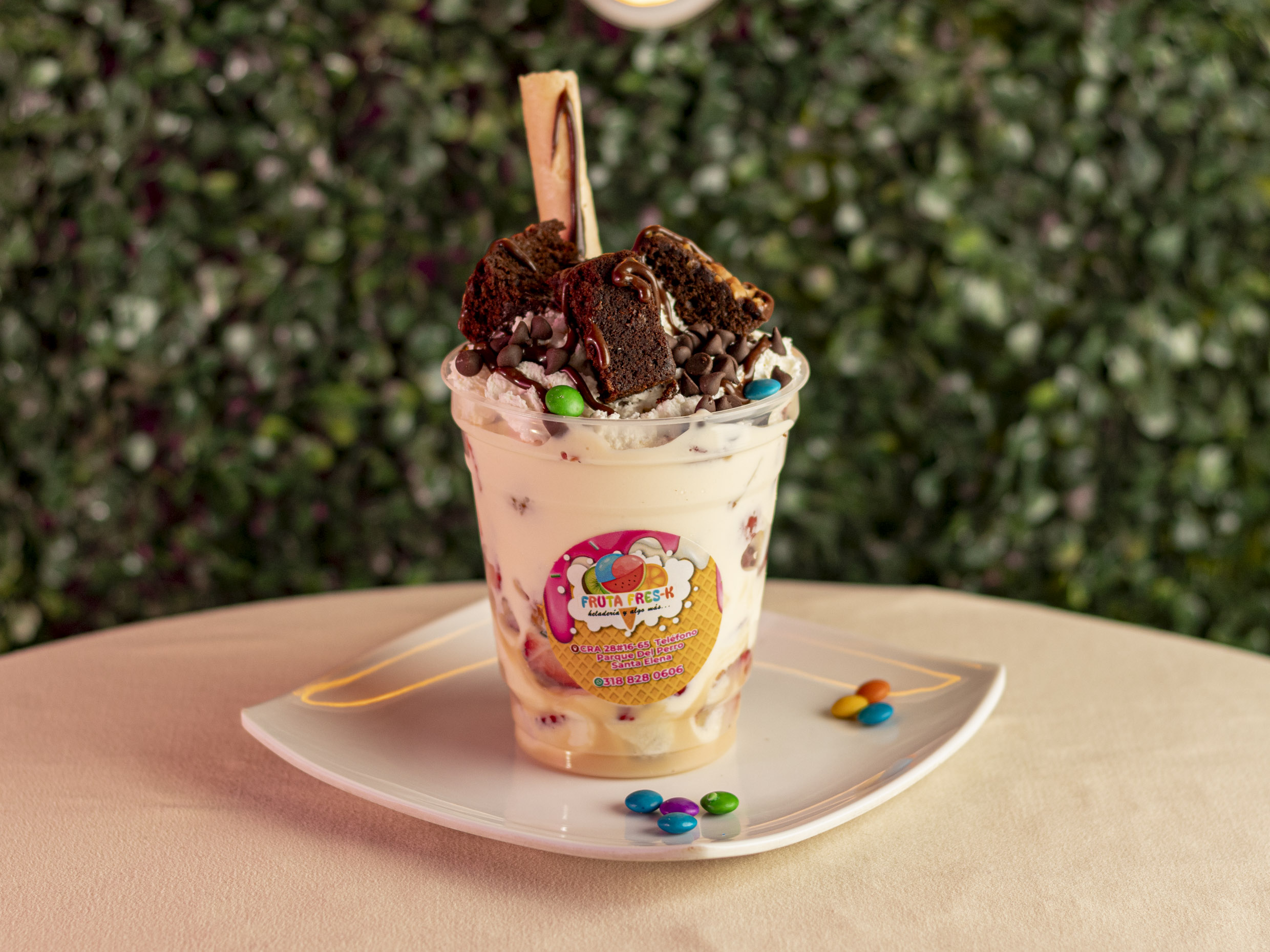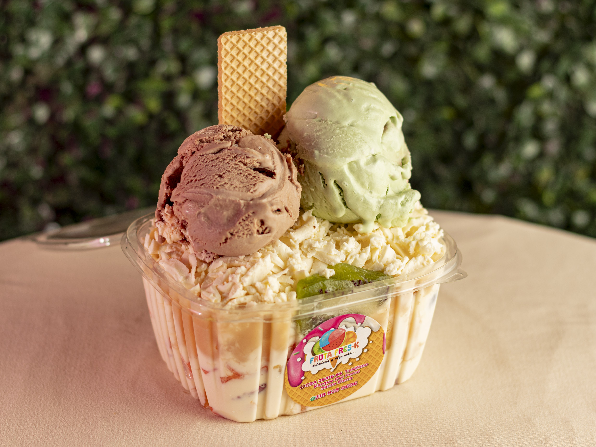 Mango, fresa, manzana, banano, 1 sabor de helado, chantilly, chips de chocolate o colores y salsa de chocolate o leche condensada.