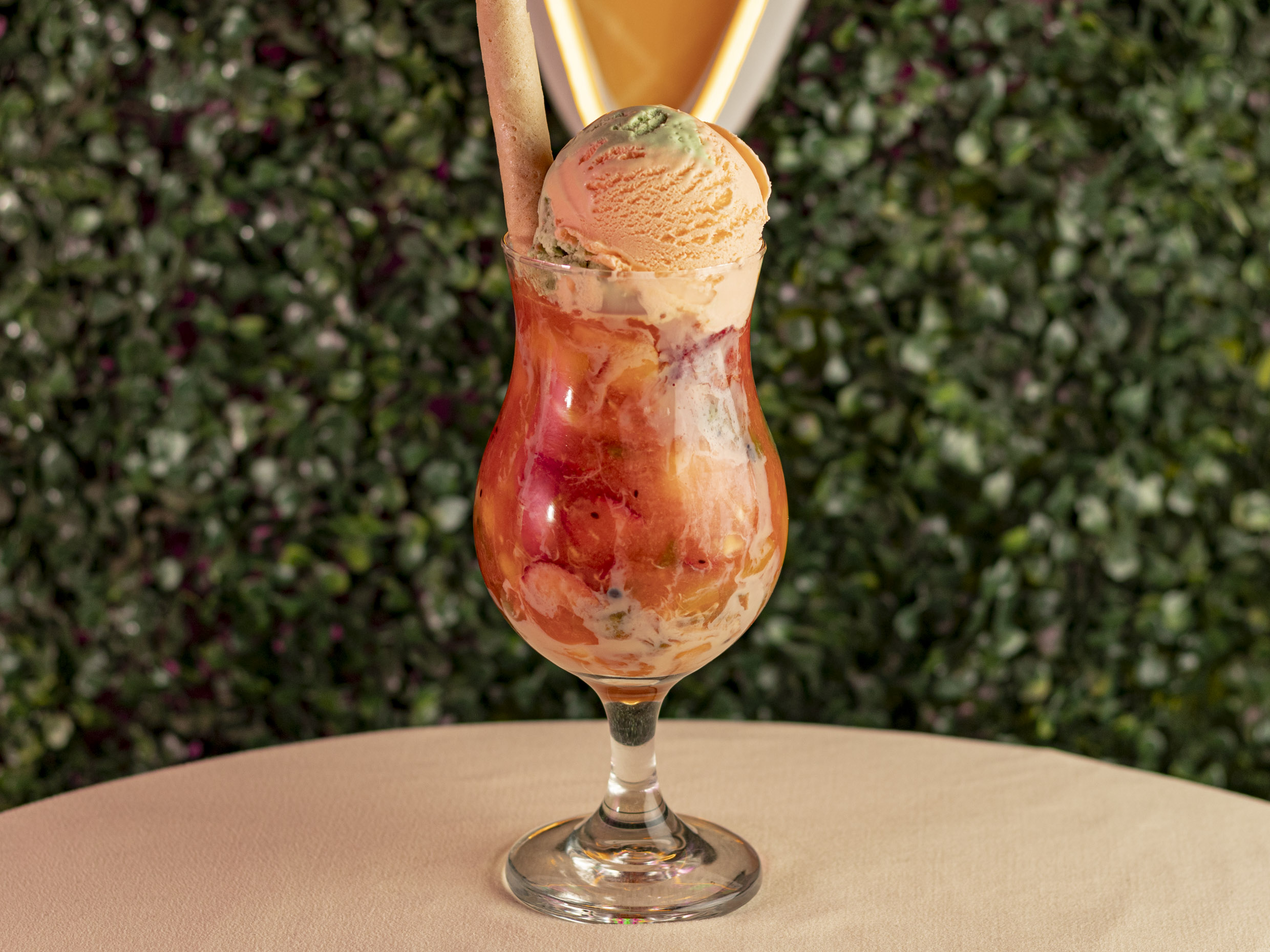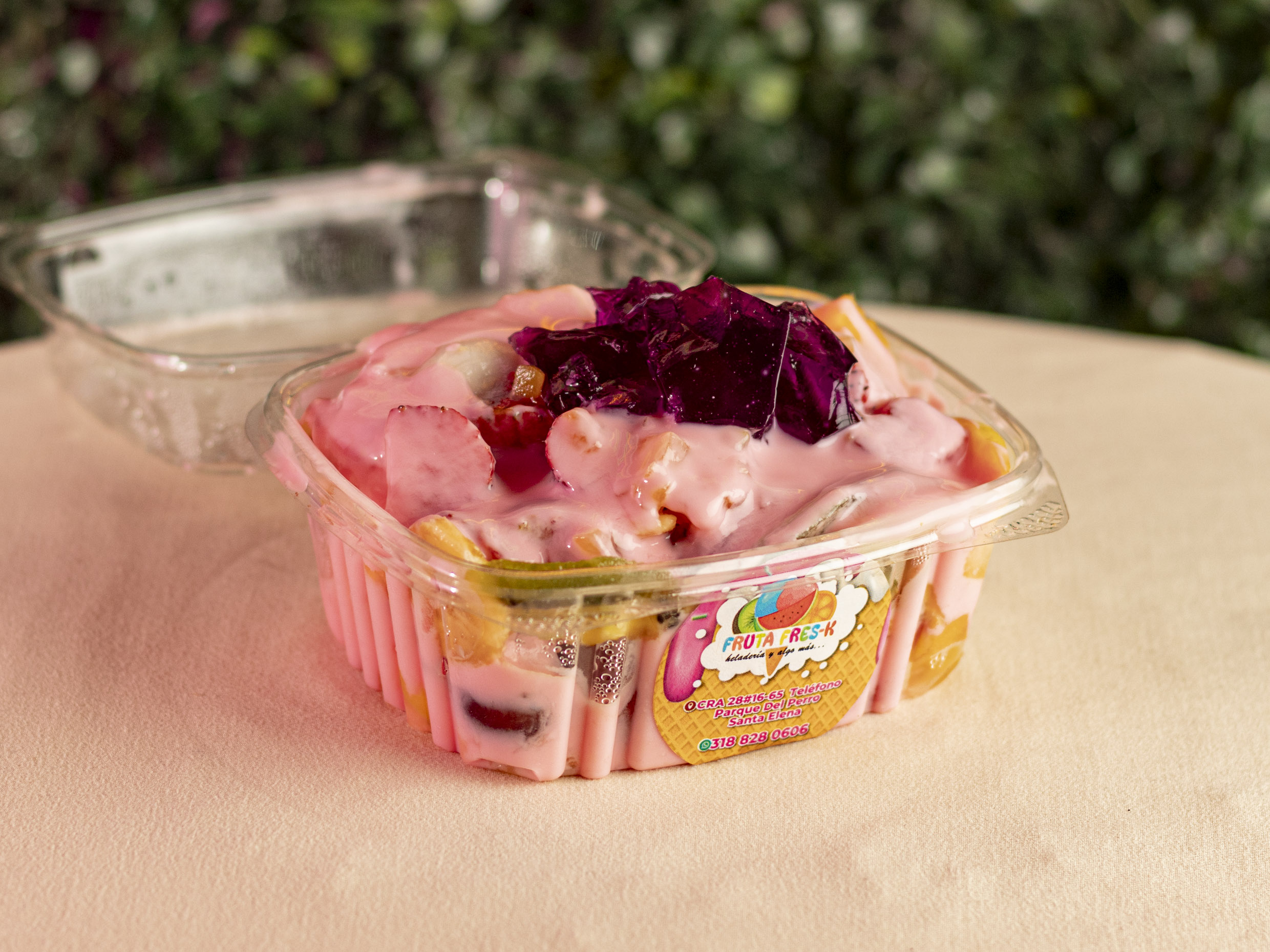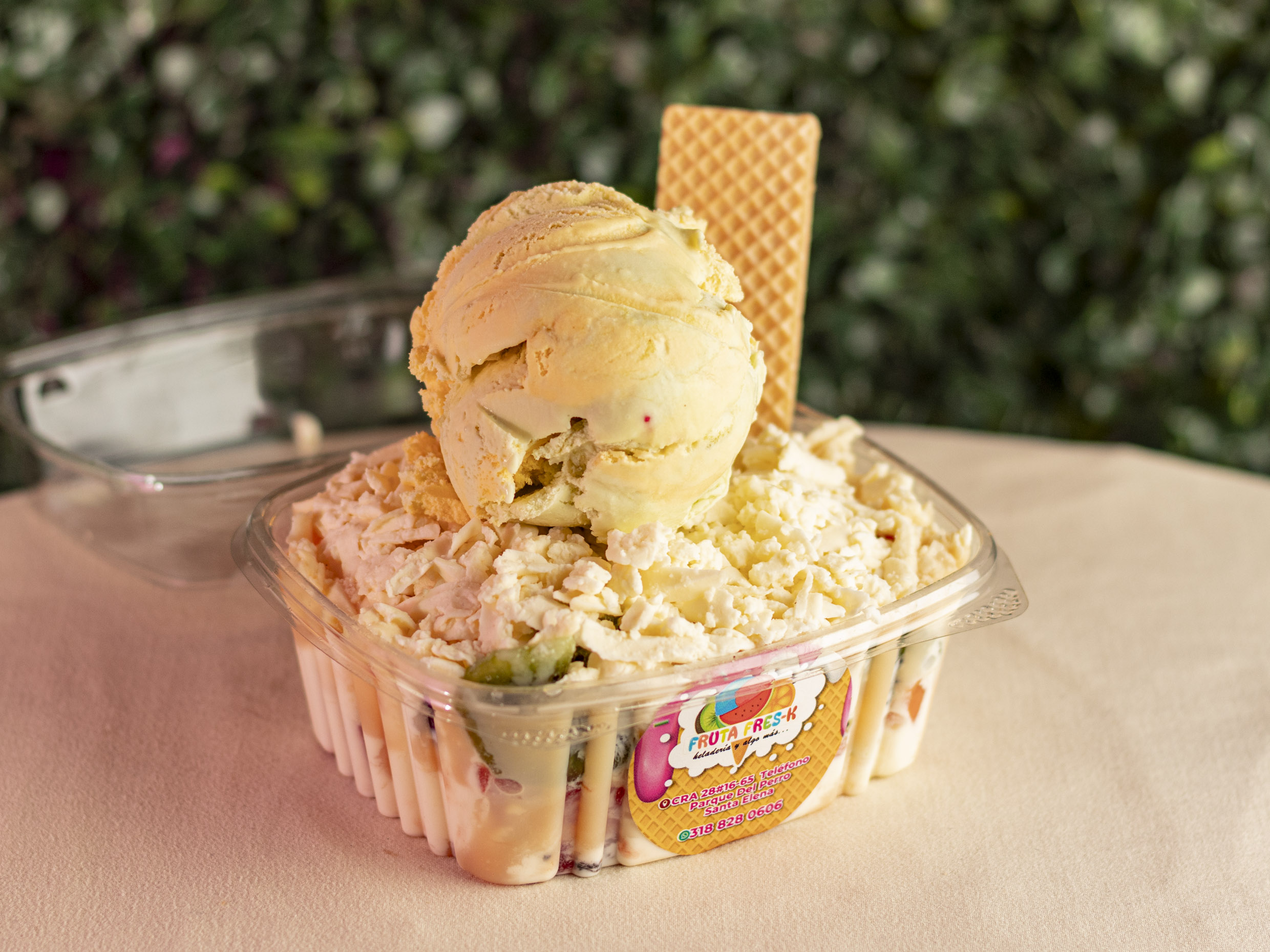 Mango, papaya, fresa, banano, durazno, queso, crema de leche y bola de helado. Ensalada de 16 onz.