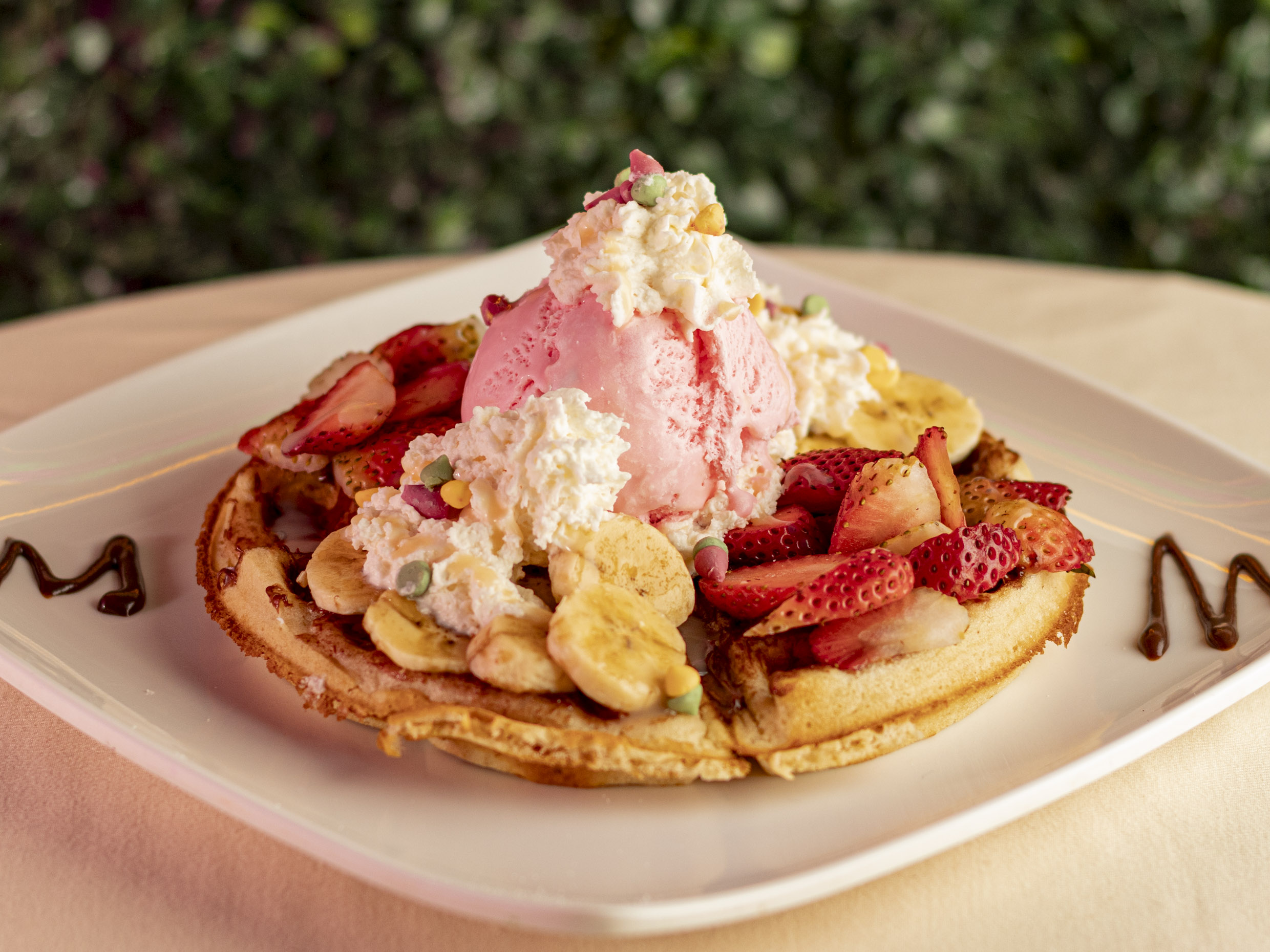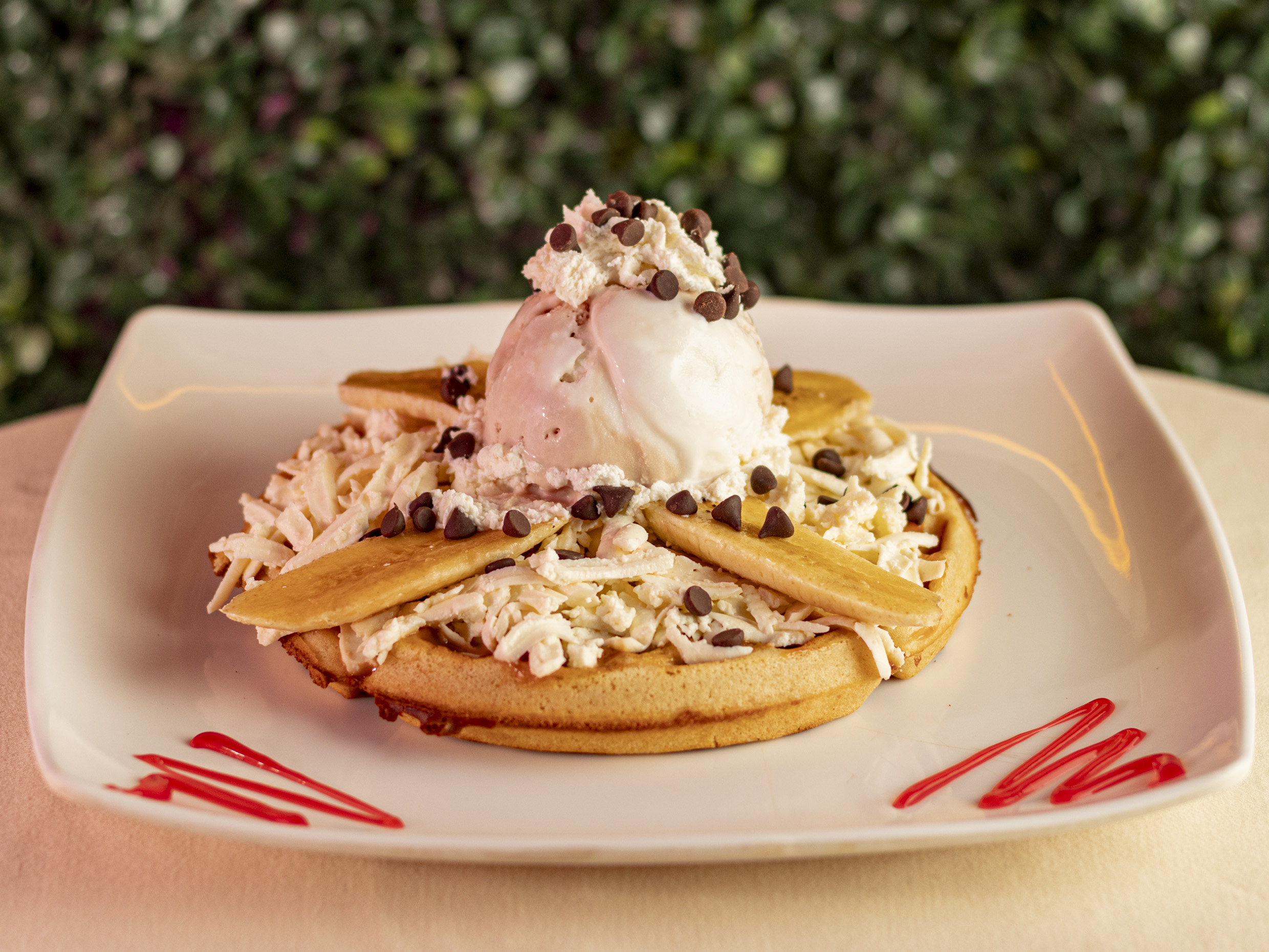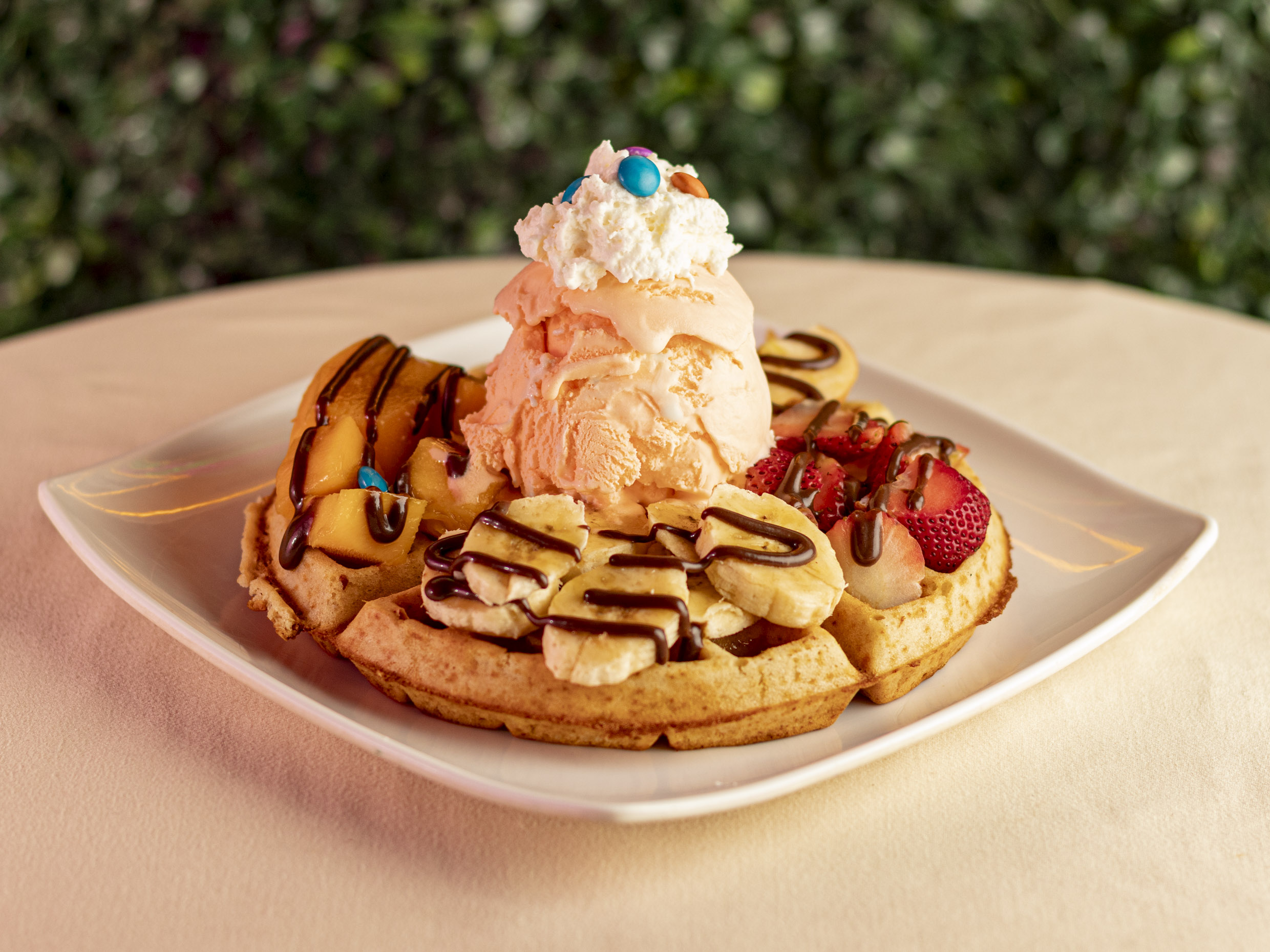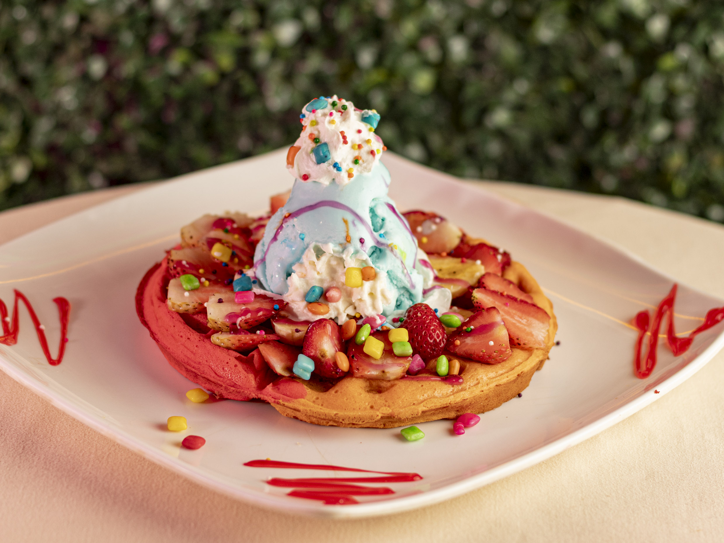 Waffle de colores, banano, fresa, chantilly, M&M y chips de colores.