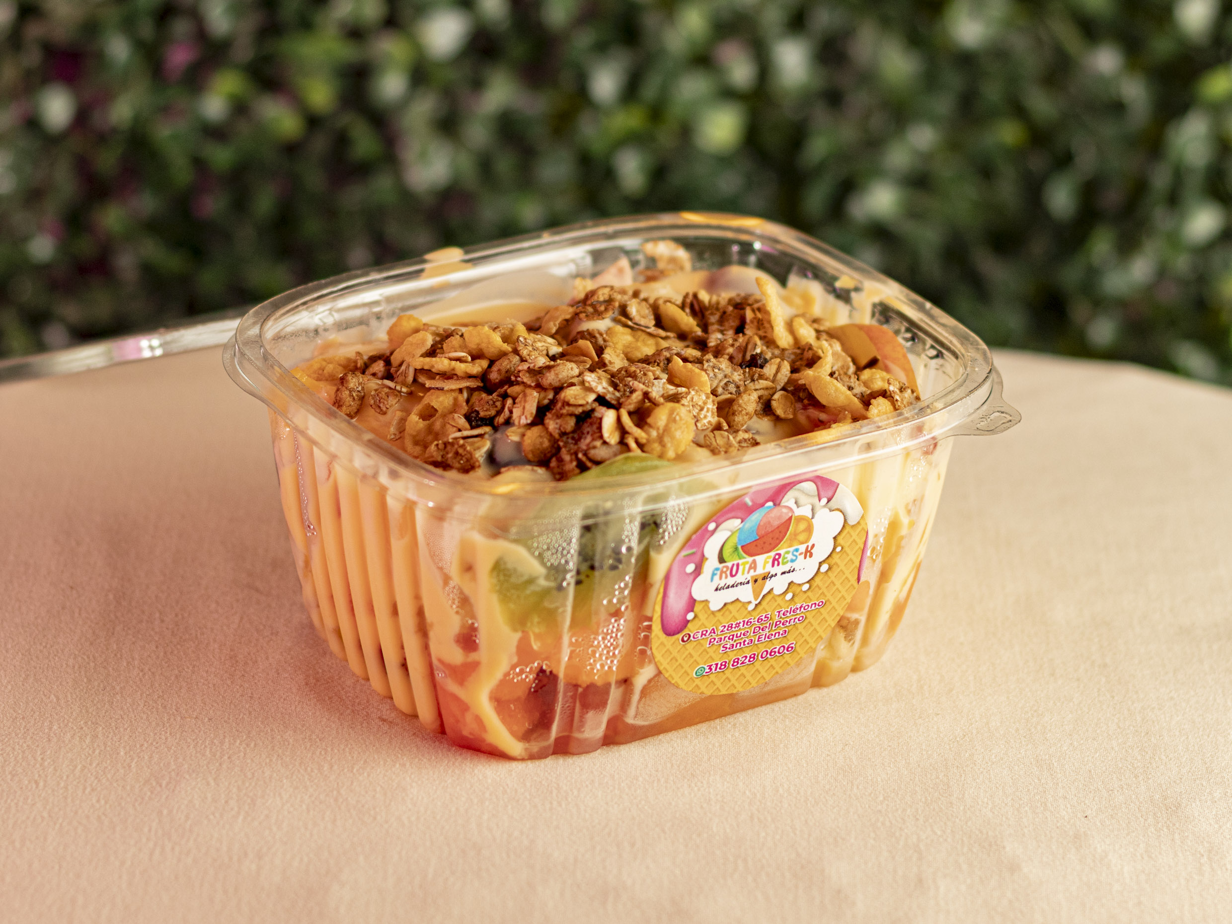 Mango, papaya, fresa, banano, durazno, kiwi, piña y guanábana. Toppings a elección y sabor de yogur a elección.