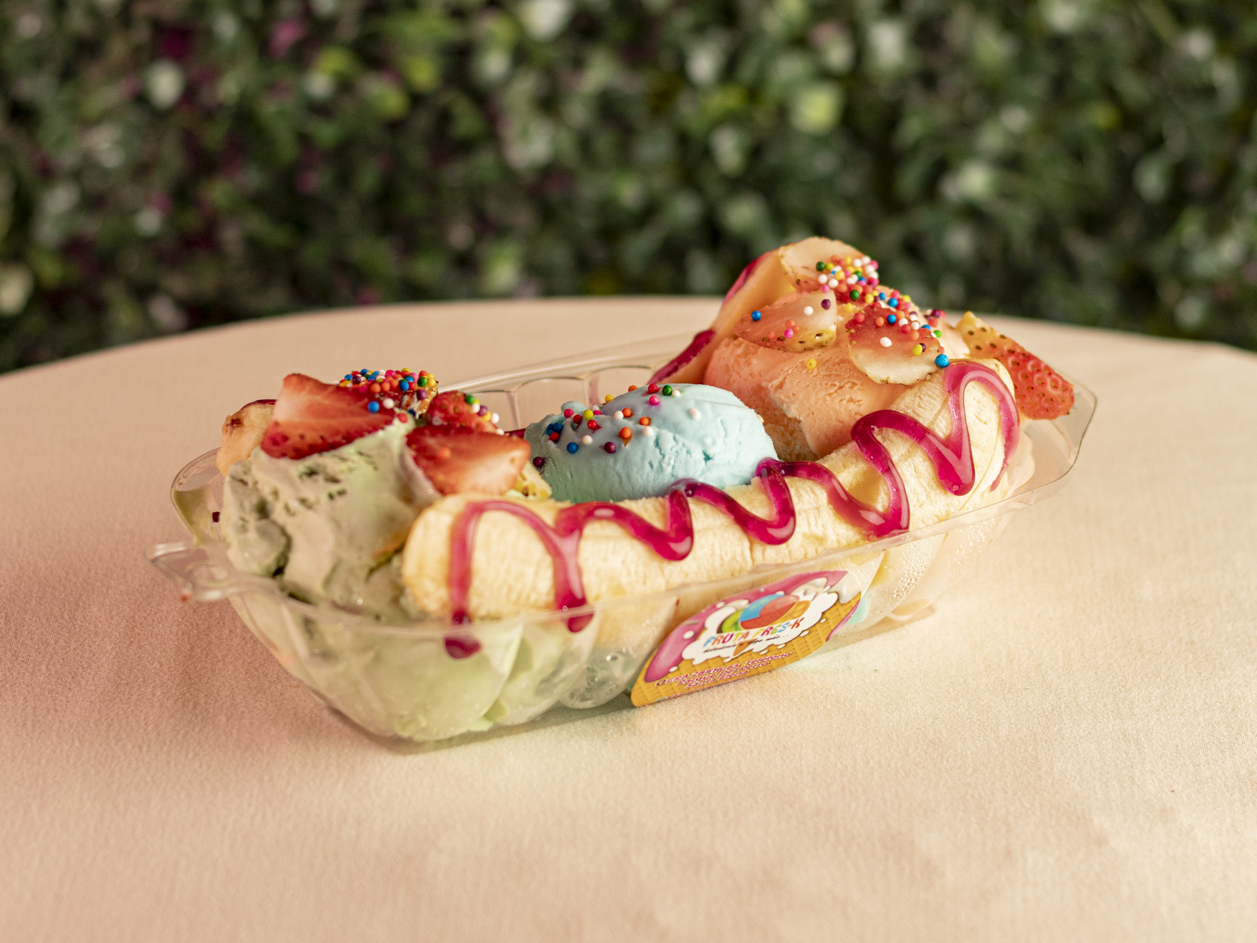 Banano, crema de leche, queso, barquilla, cremas de helado, lechera, topping de colores o chocolate.