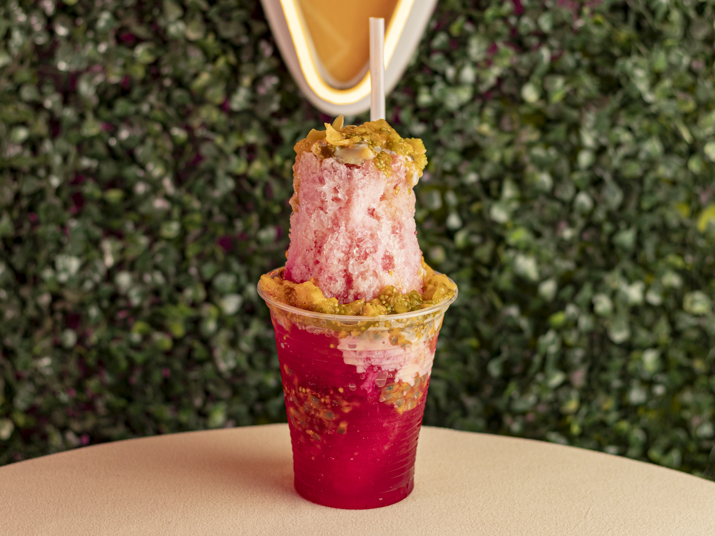 Sirope, trozos de lulo con maracuyá, leche condensada, limón y hielo granizado.