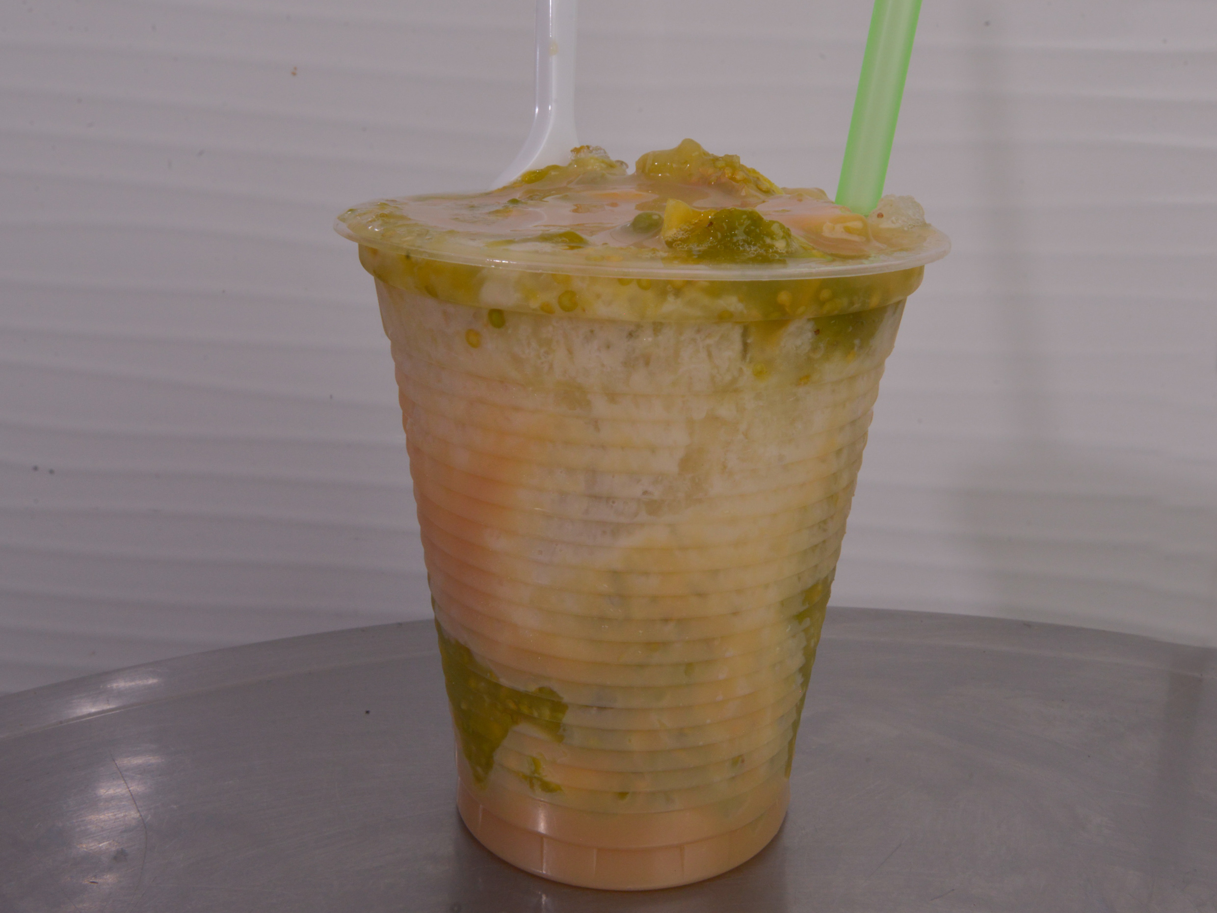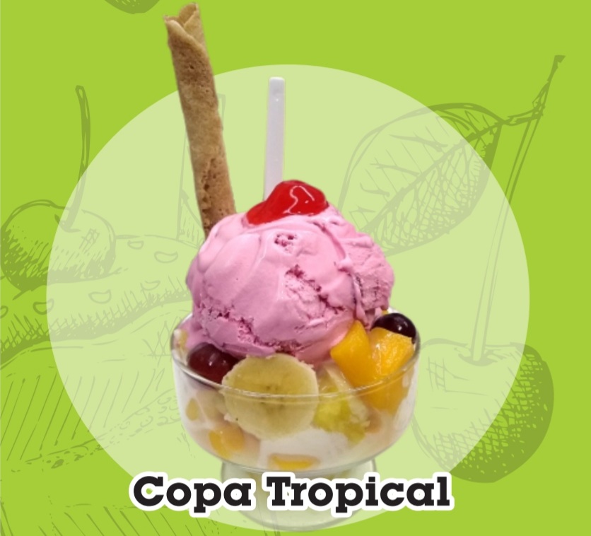 Banano, piña, mango, uva ,crema de leche lechera y 1 bola de helado.
