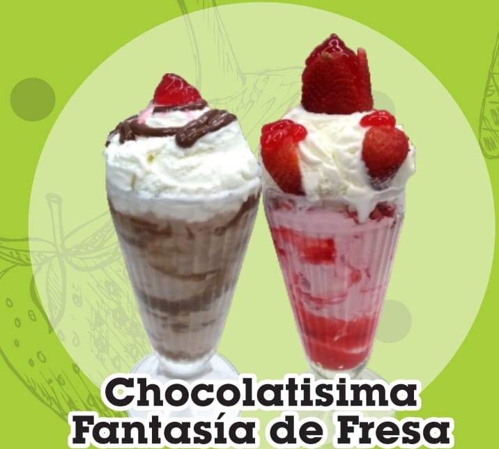 Helado de fresa, vainilla,fresas picadas y salsa de fres