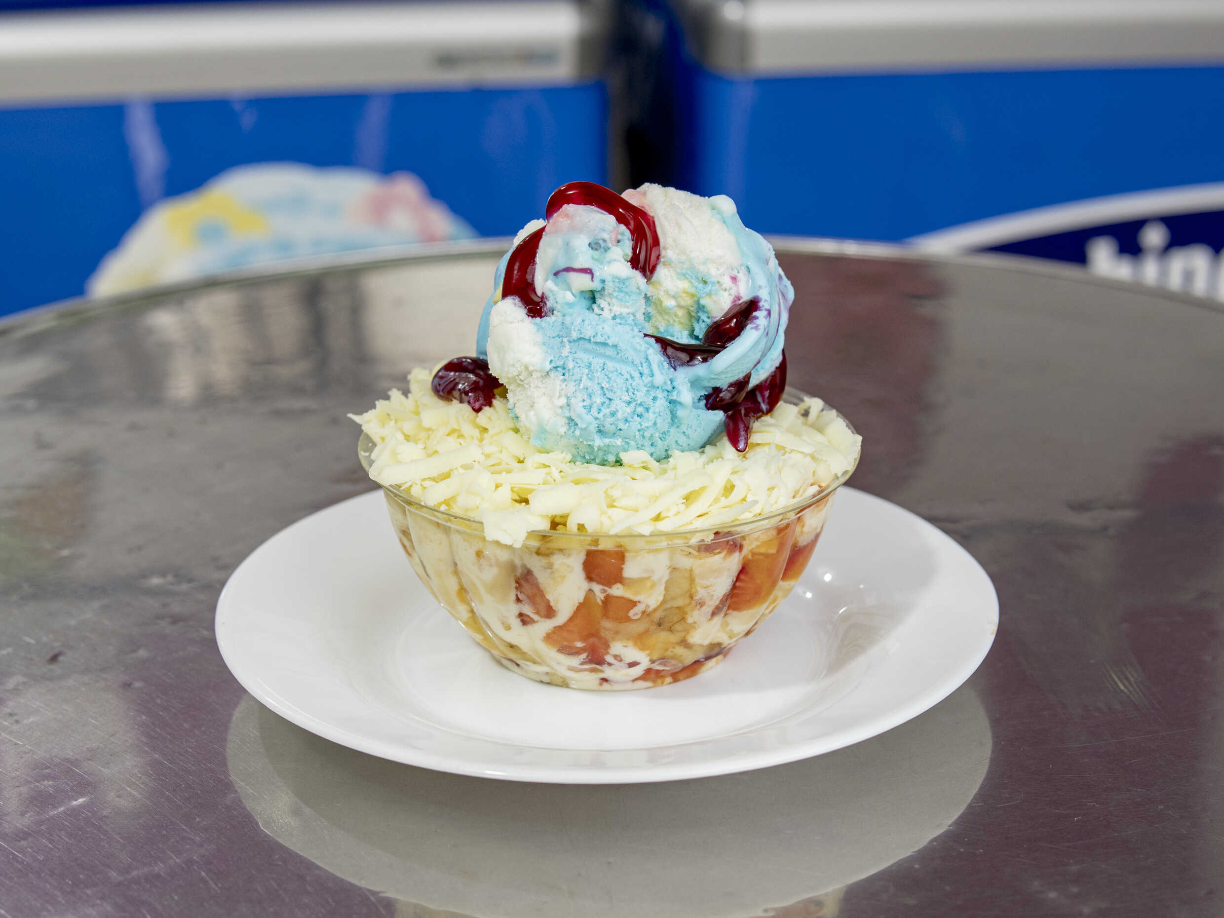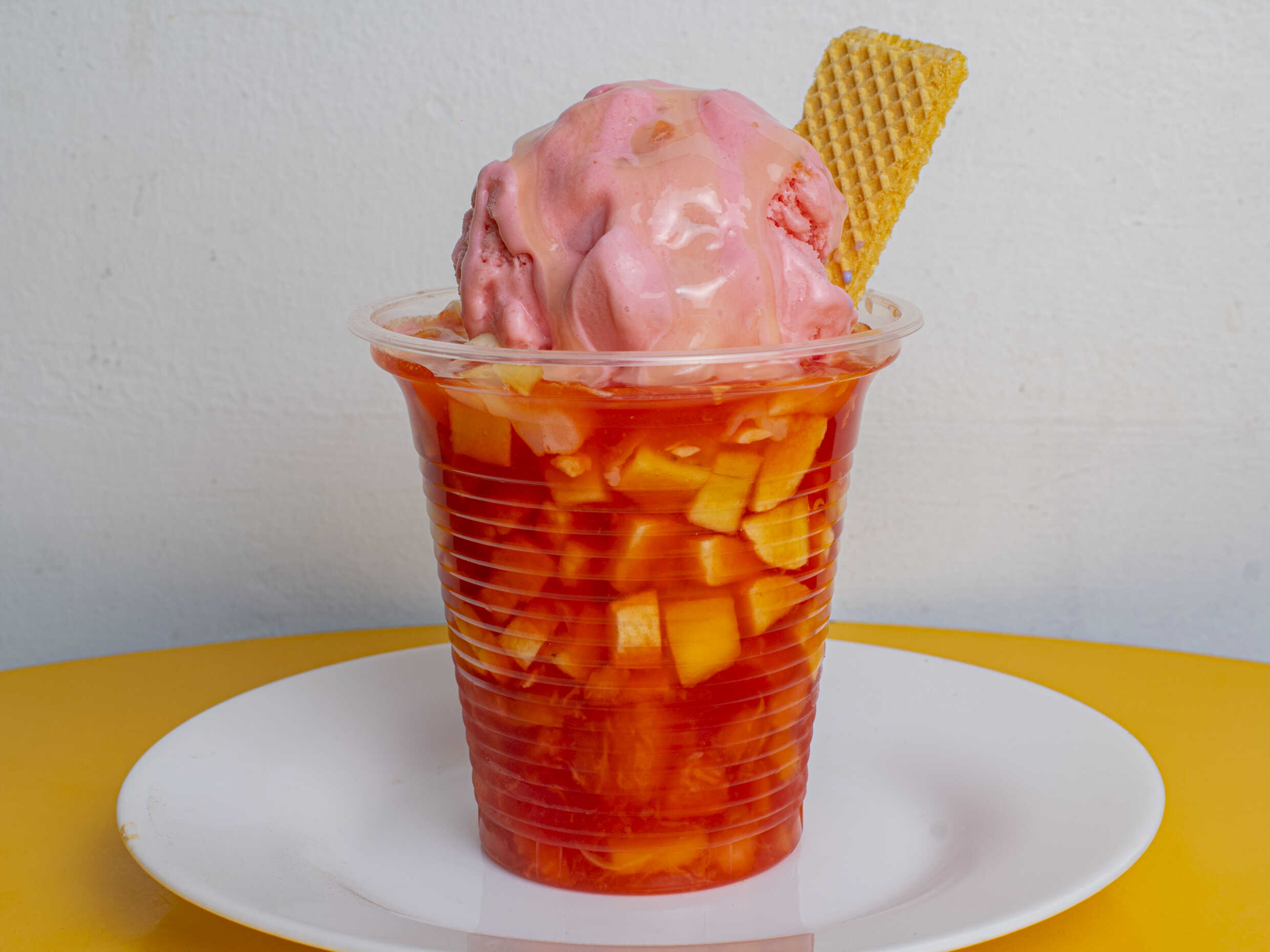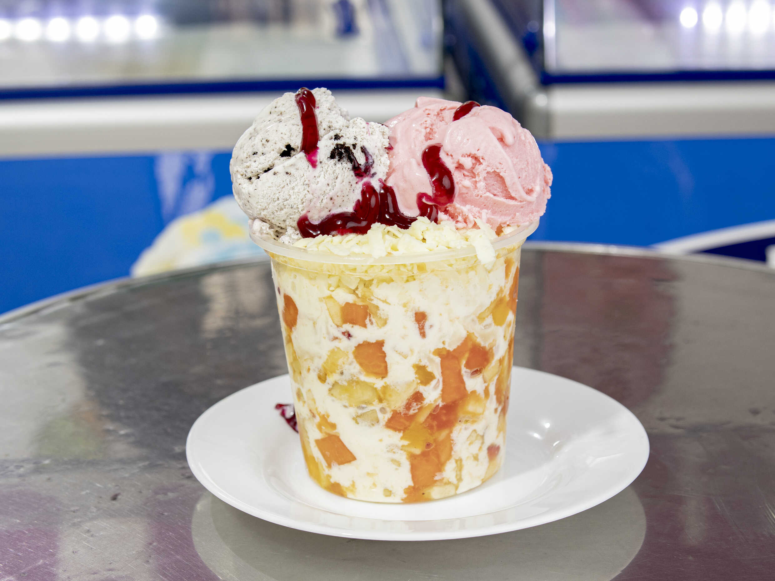 Ensalada de 24 Oz Banano, fresas, papaya, mango, manzana, queso mozarella crema de leche, leche condensada y dos bolas de helado a elegir .
