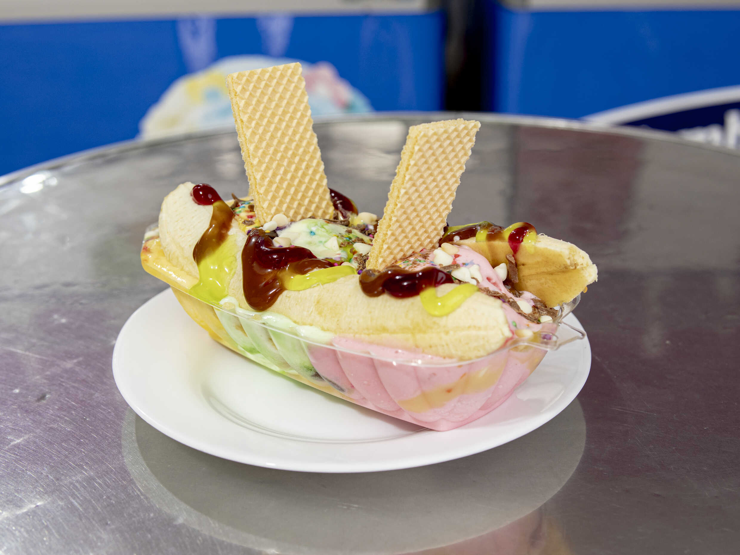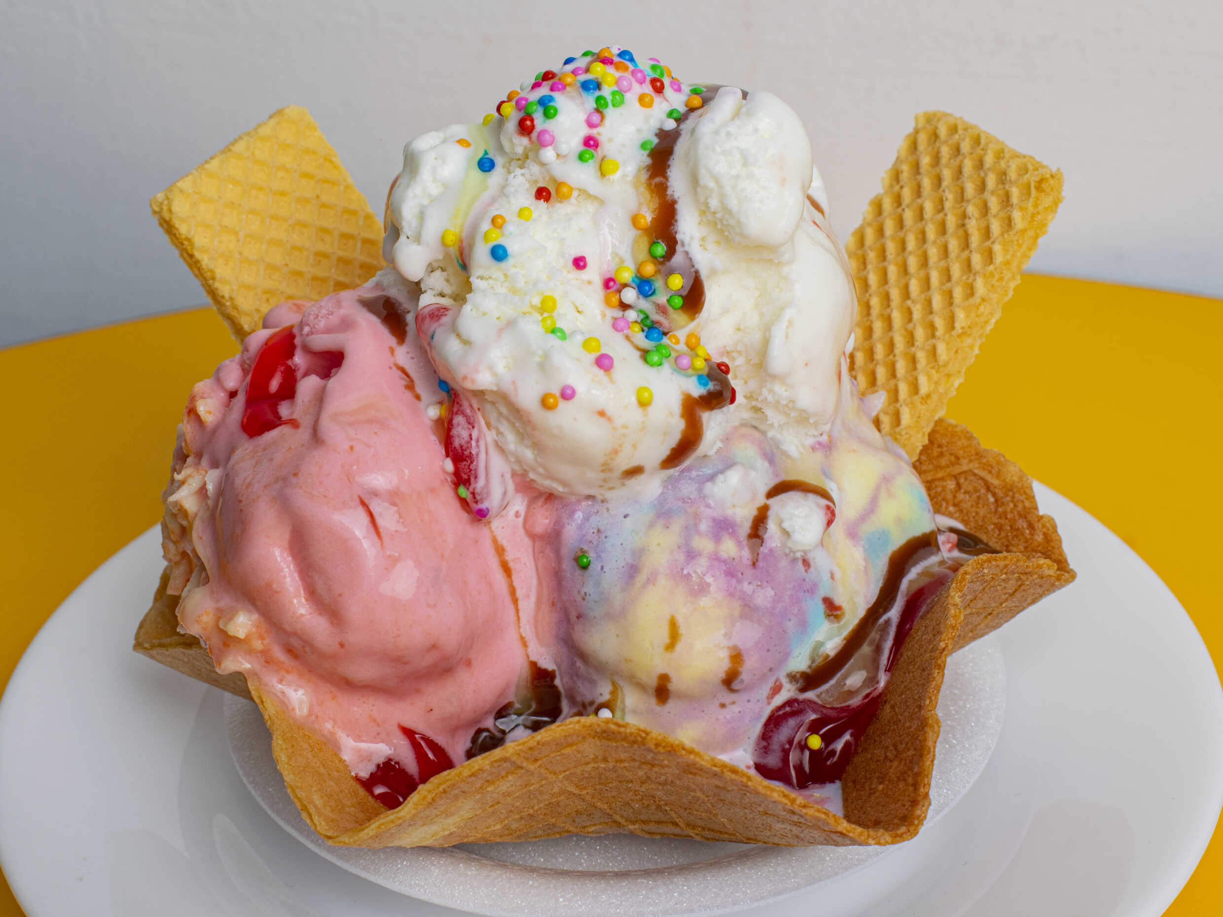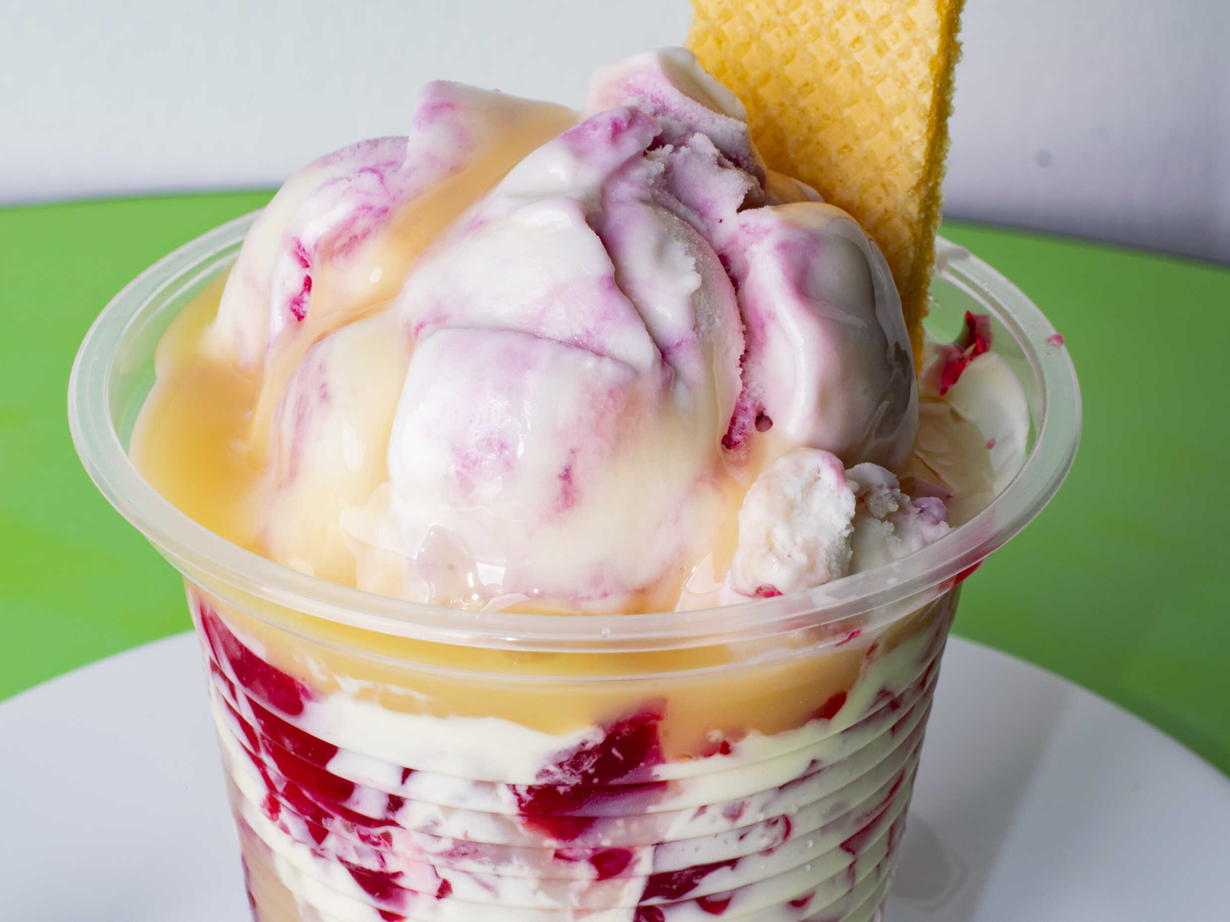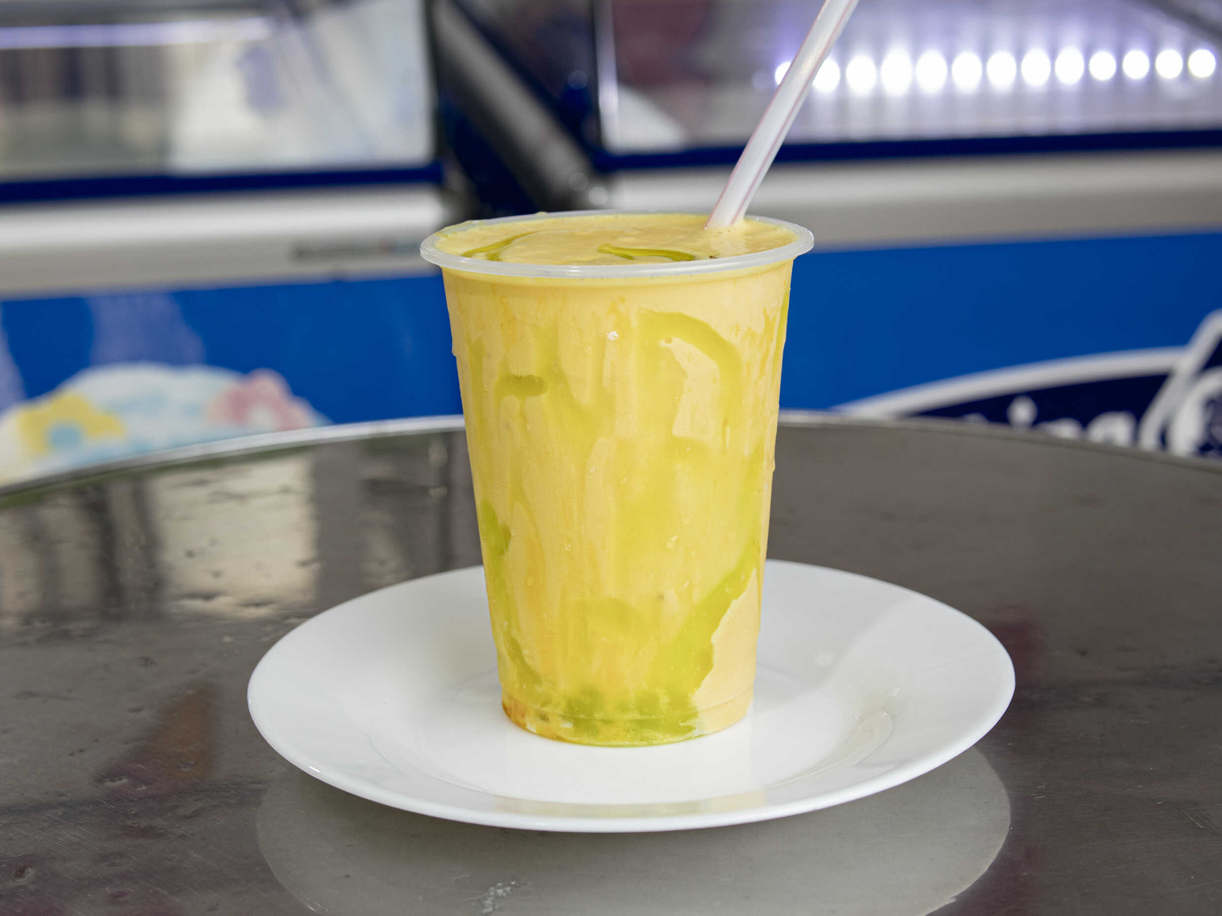 Ensalada de 24 Oz Banano, fresas, papaya, mango, manzana, queso mozarella crema de leche, leche condensada y dos bolas de helado a elegir .