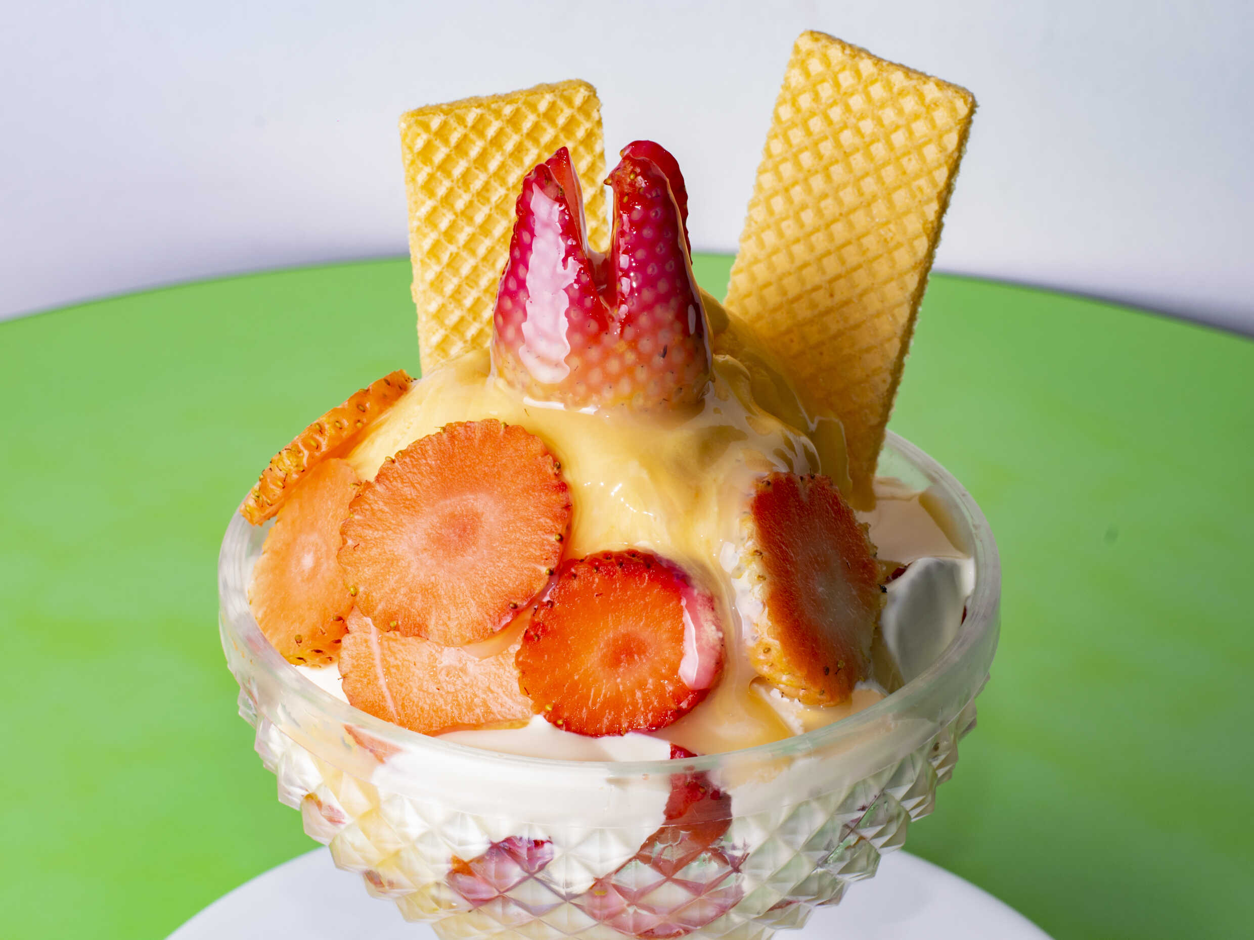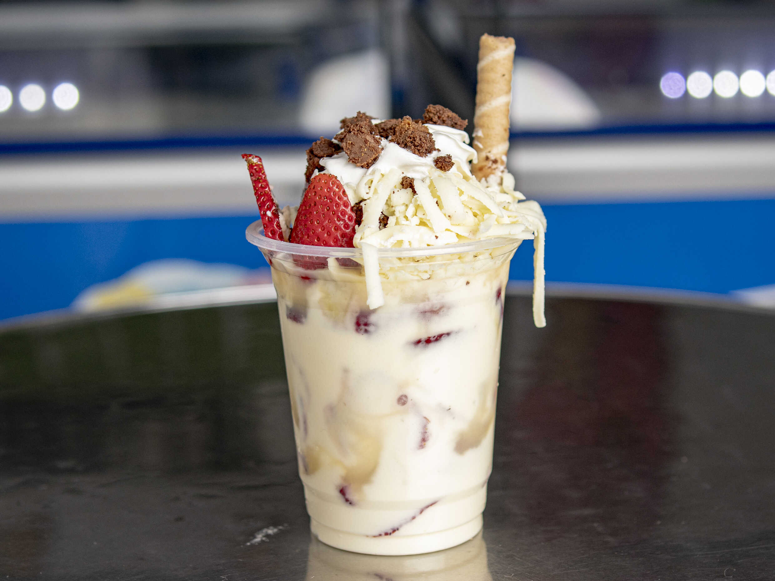 Vaso con fresas, leche condensada, crema de leche. y una bola de helado