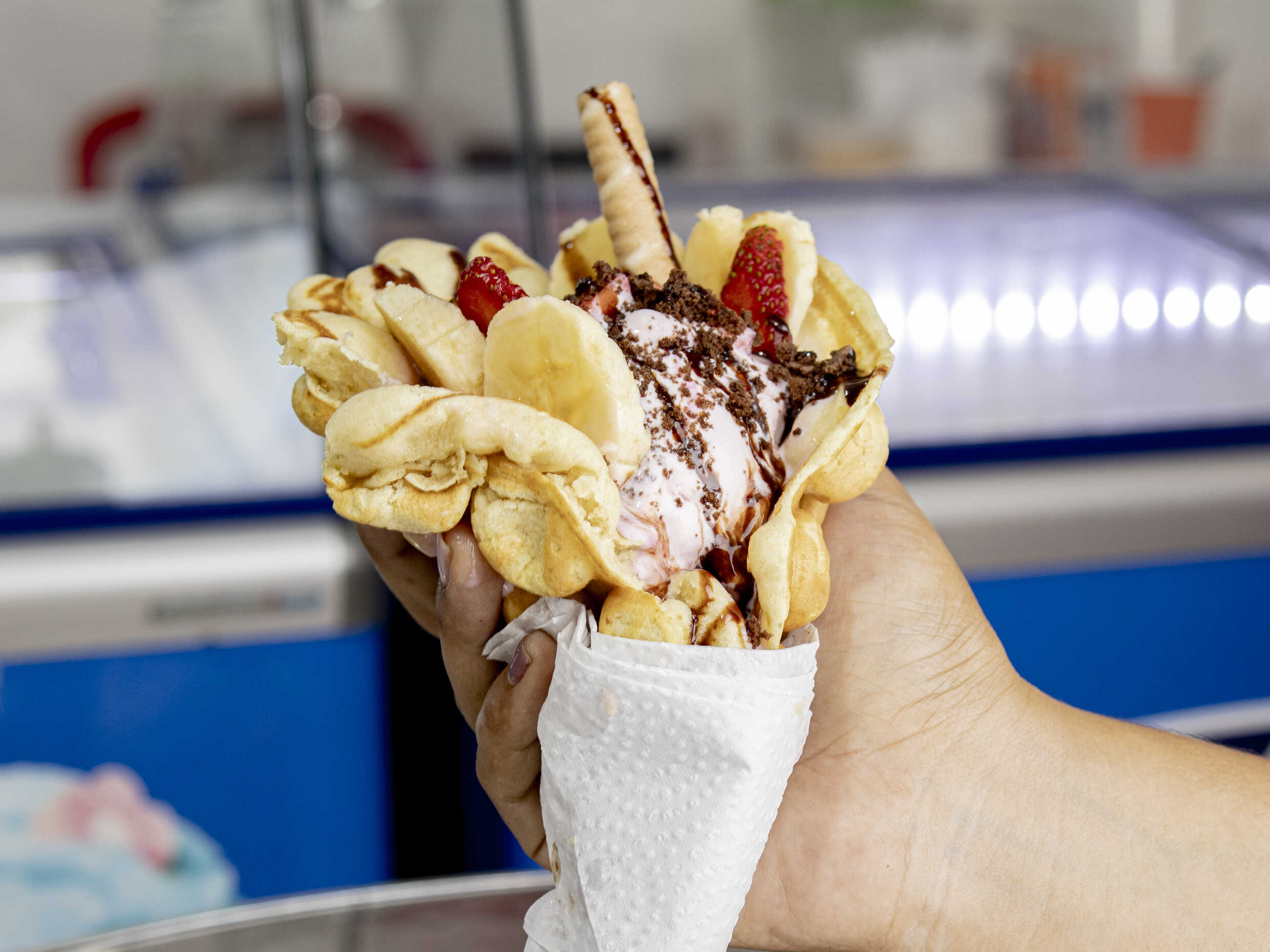 Banano, fresas, papaya, mango, manzana, queso mozarella, crema de leche, leche condensada y una bola de helado.