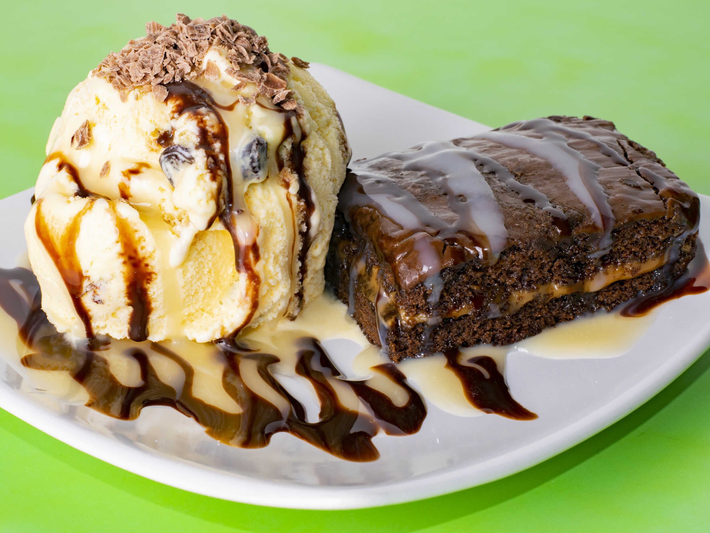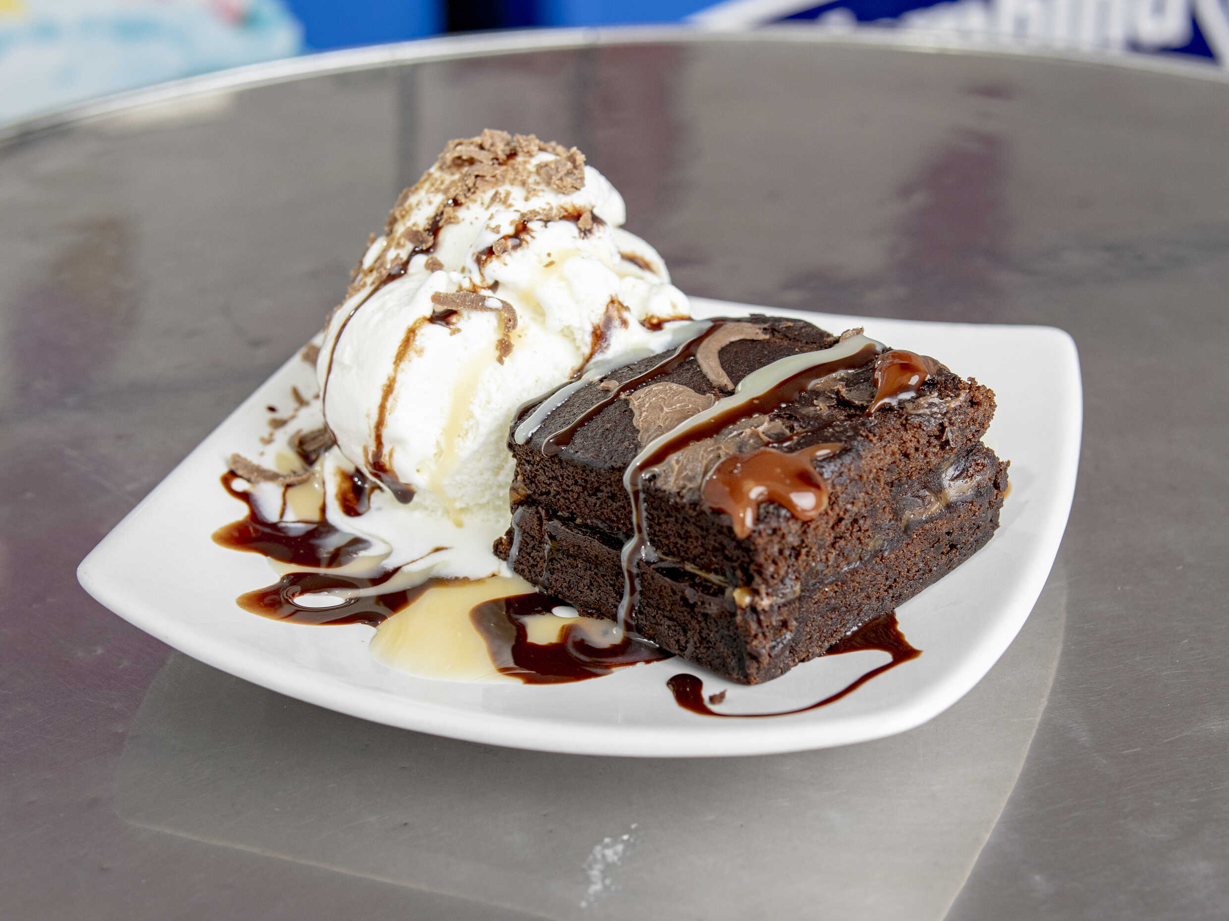Bola de helado, pastel de brownie ,salsa de chocolate, chips de chocolate y lechera