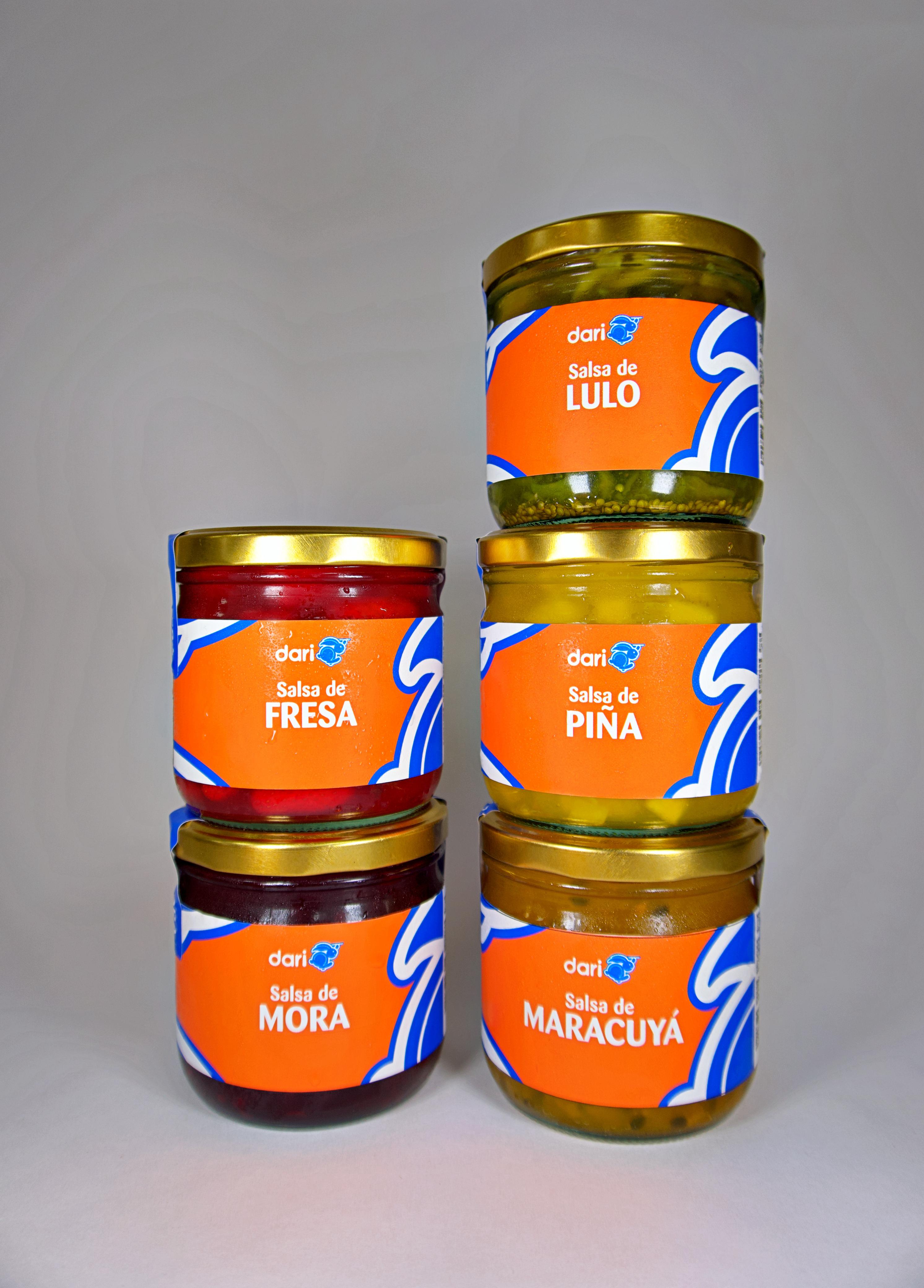 Recipiente de vidrio con nuestra salsa tradicional x 250 gramos sabor a elección entre fresa, mora, piña, lulo o maracuya