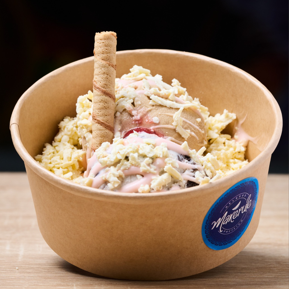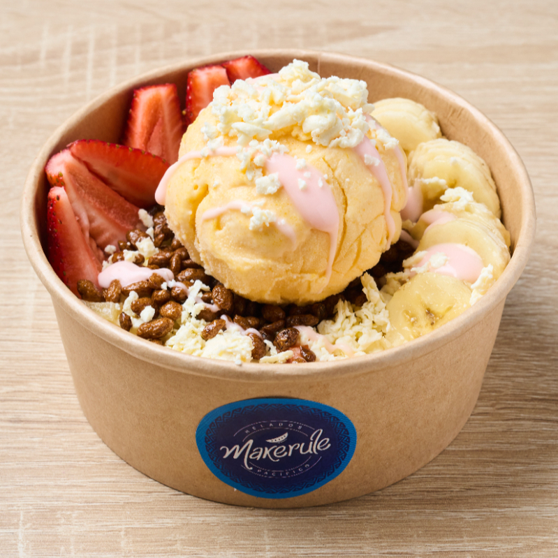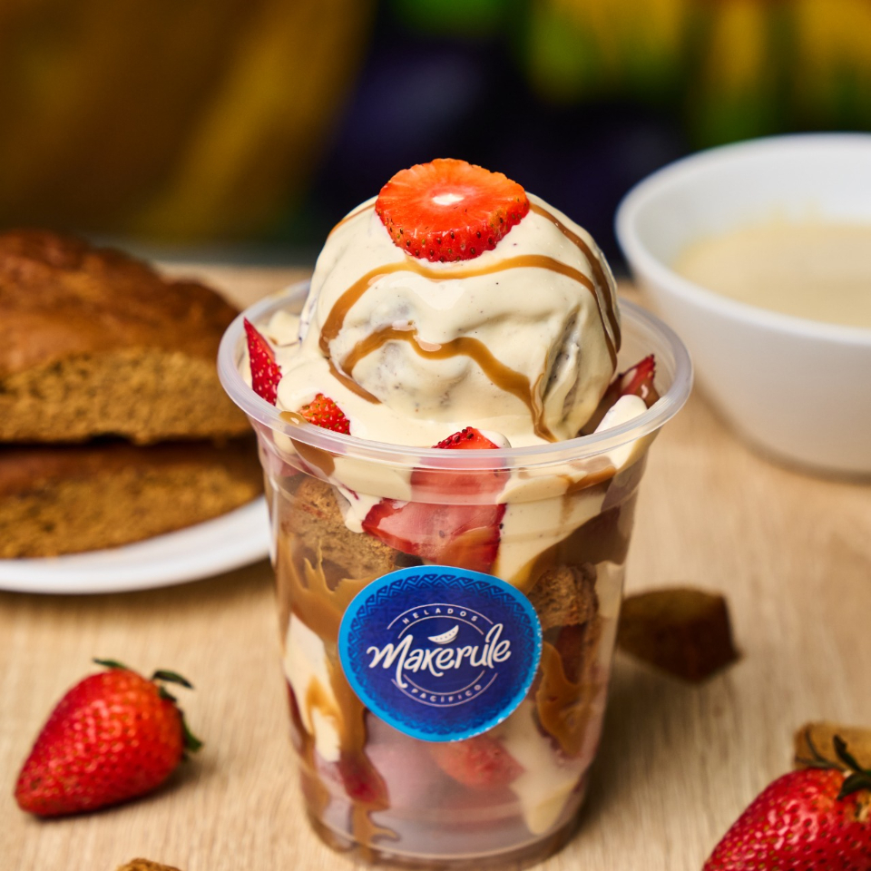 Deliciosa combinación de fresas frescas con trozos de galleta cuca chocoana, con cremosa base especiada, frutas frescas de tu elección, arequipe y bola de helado de tu elección.