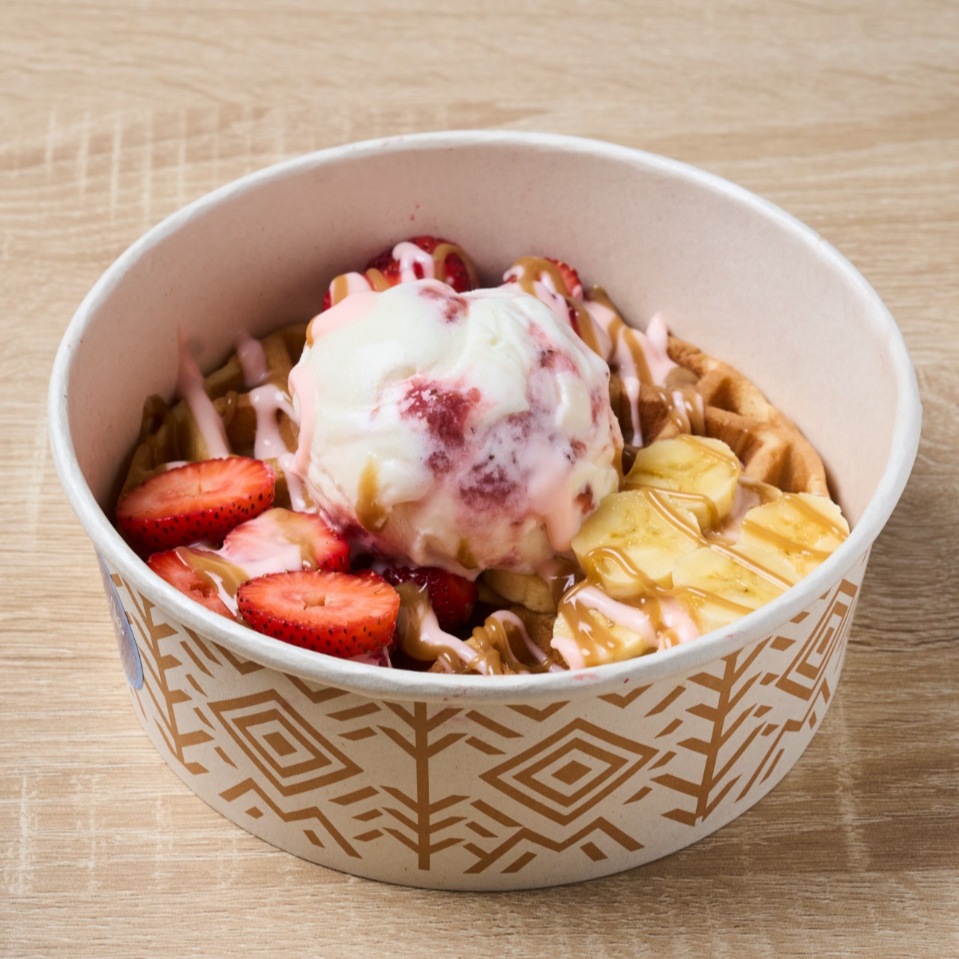Esponjoso Waffles con frutas (fresas y banano), con crema ayogurtada, arequipe y helado de tu preferencia