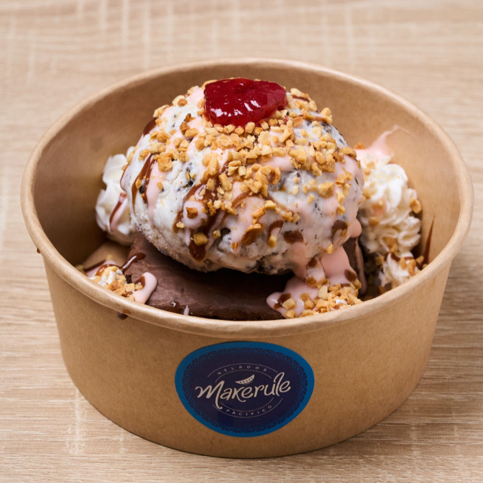 Porcion de Brownie Caliente, helado, en lluvia de Chocolate, crema ayogurtada, mani, Chantilly y fresa